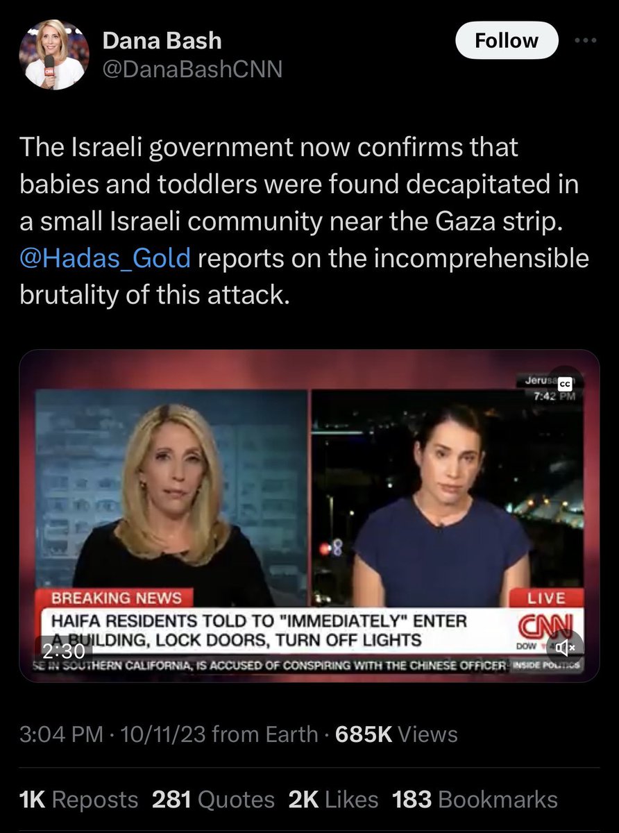"Israeli prime minister spokesman just confirmed - Babies and toddlers were found with their heads decapitated in Kfar Aza in Southern Israel." @sarasidnerCNN