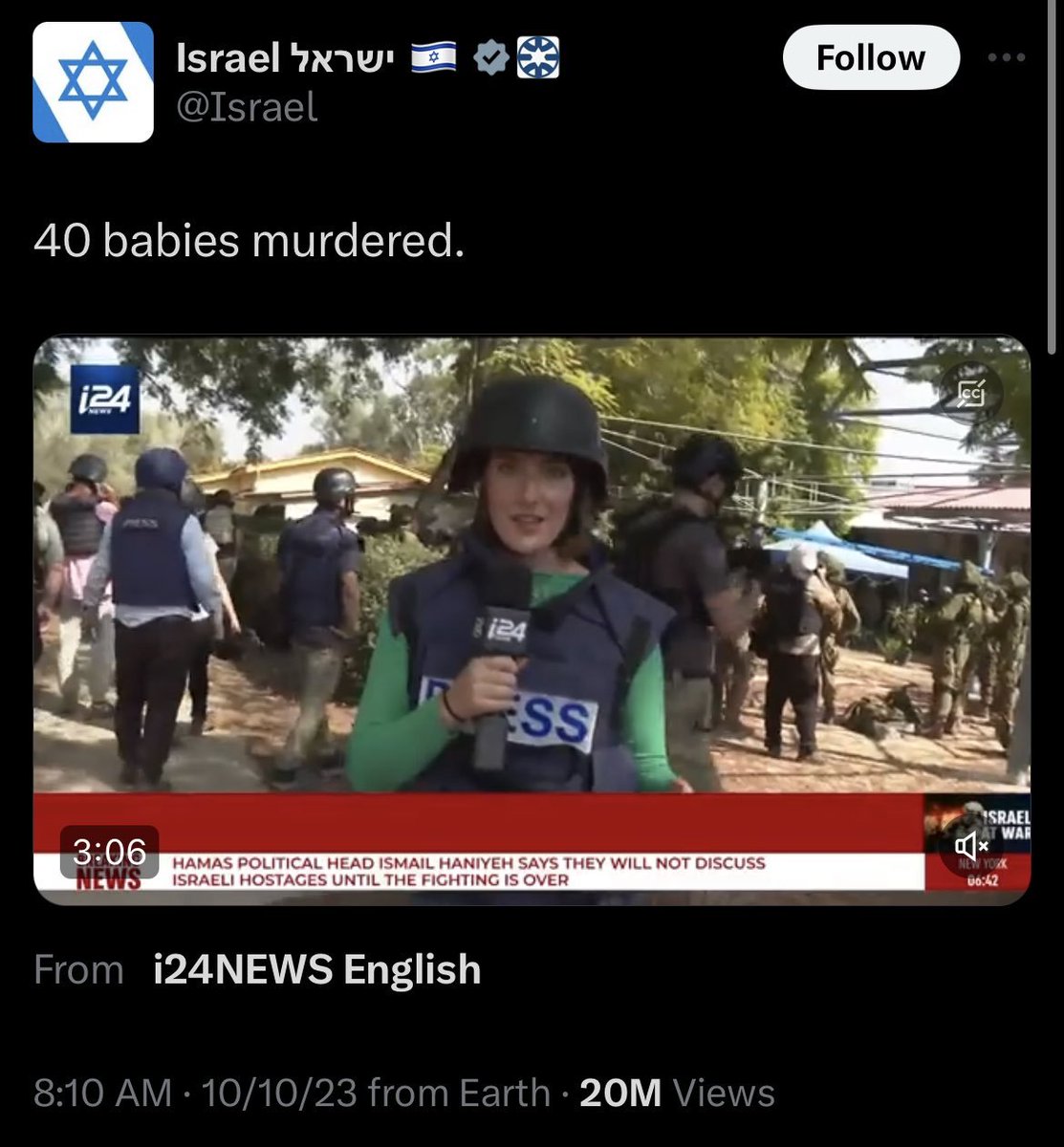 An Israeli reporter initially reported beheaded babies at 1:42 PM on October 10, and later mentioned 40 babies on hospital stretchers at 2:10 PM IST. Only 6 hrs later, CNN would start spreading the claim