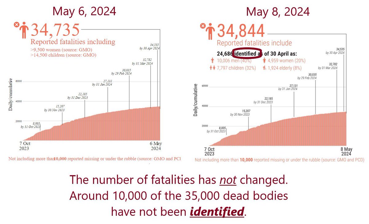 There are many reasons why 10,000 bodies are not identified. 🪦Bodies are badly burnt 🪦Bodies are blown to pieces 🪦Bodies are decayed in makeshift graves 🪦Because Gaza is in chaos, families and civil servants can't ID the dead with 100% certainty