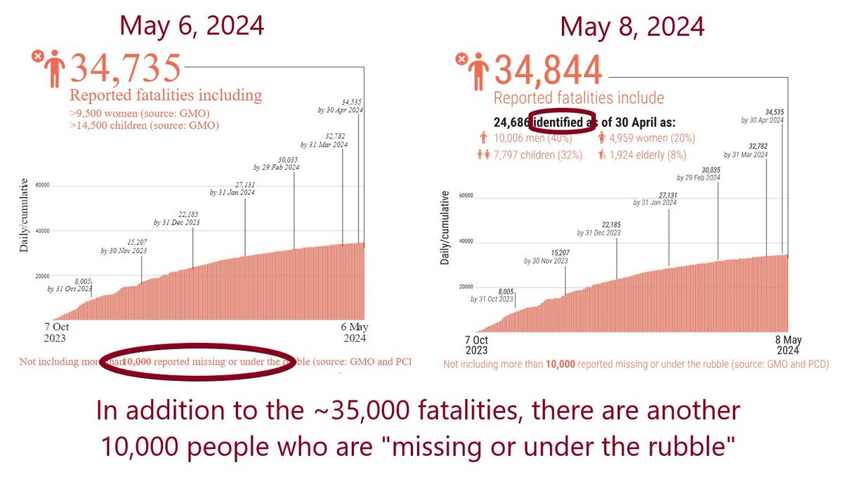 Original sources from UN May 6 🔗 https://www.ochaopt.org/content/hostilities-gaza-strip-and-israel-reported-impact-day-213 May 8 🔗 https://www.ochaopt.org/content/hostilities-gaza-strip-and-israel-reported-impact-day-215