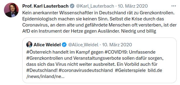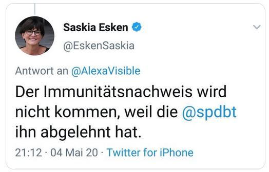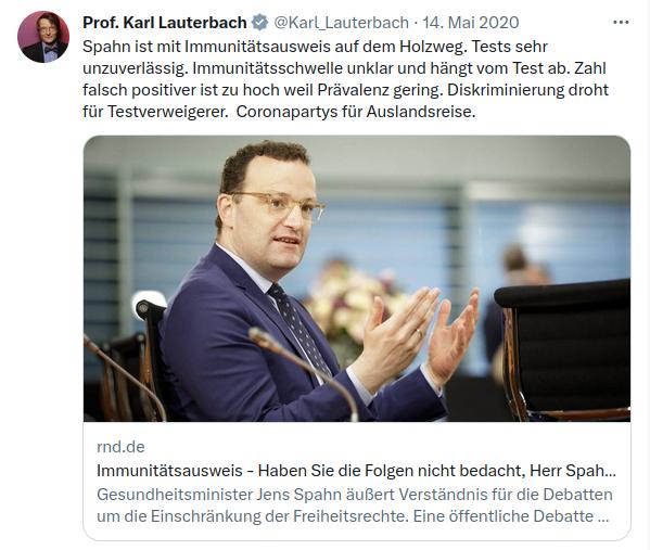 03.05.20 #Lauterbach und viele weitere Politiker kritisieren einen Immunitätsausweis: "Wenn der Ausweis Vorteile bringt gibt es Corona-Partys. Bringt er Nachteile folgt Testvermeidung" "Einladung zu Diskriminierung und Entsolidarisierung". https://www.tagesspiegel.de/politik/wenn-der-ausweis-vorteile-bringt-gibt-es-corona-partys-5065039.html
