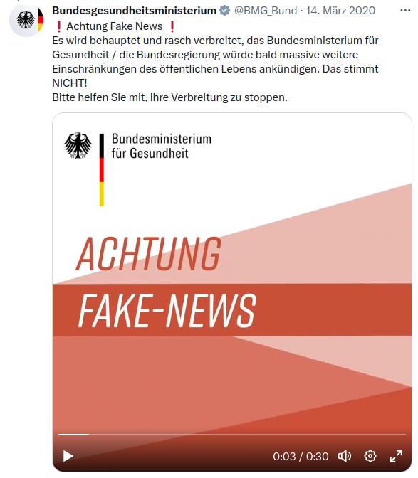 14.03.20 Das #BMG warnt vor Fakenews, dass Einschränkungen des öffentlichen Lebens geplant seien.