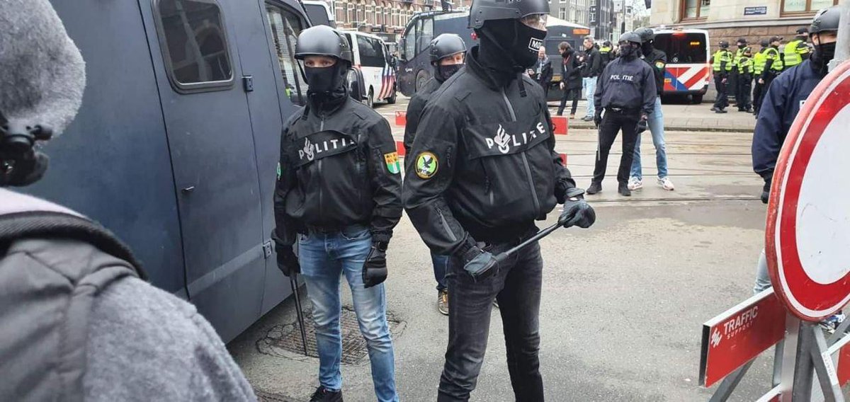 16.1.22 Die Polizei in #Frankfurt am Main überprüft Abstände zwischen Demonstranten mit Abstandshölzern.