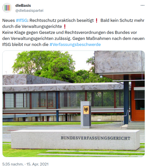 15.04.21 #BASIS: Novelle des #IfSG und Zentralisierung der Entscheidungsgewalt nach Berlin macht Klagen gegen Maßnahmen für Bürger defacto unmöglich. https://t.co/e4hm3KIaes