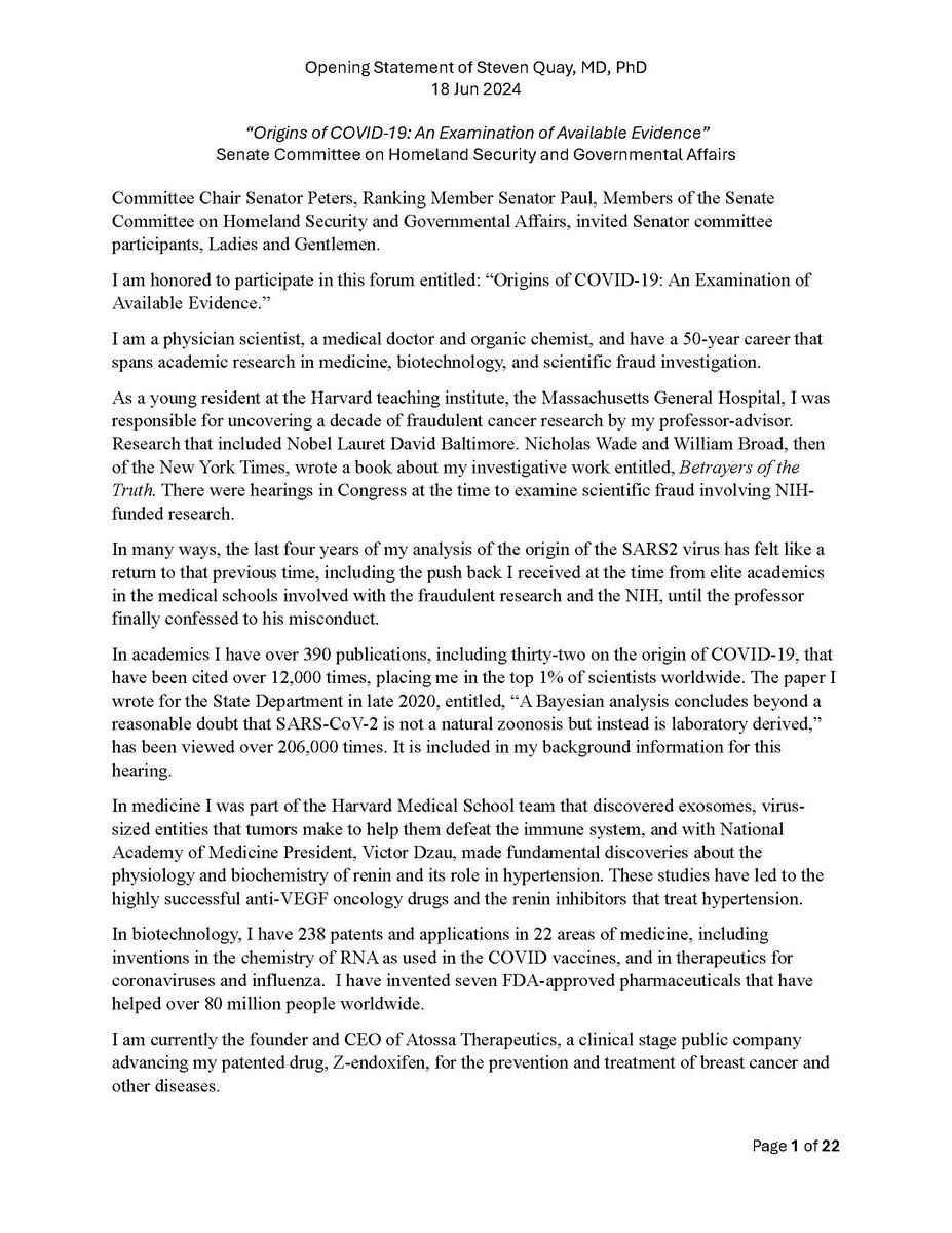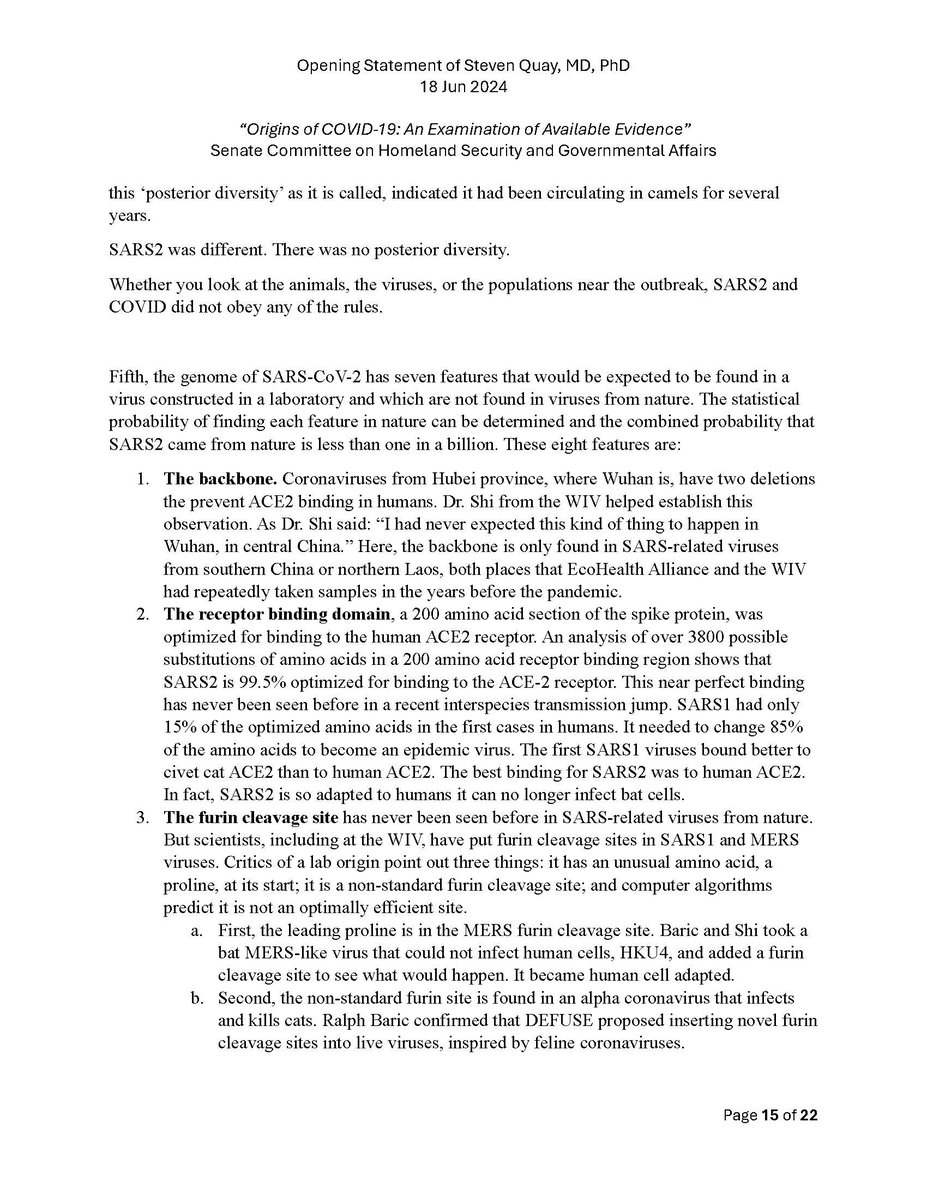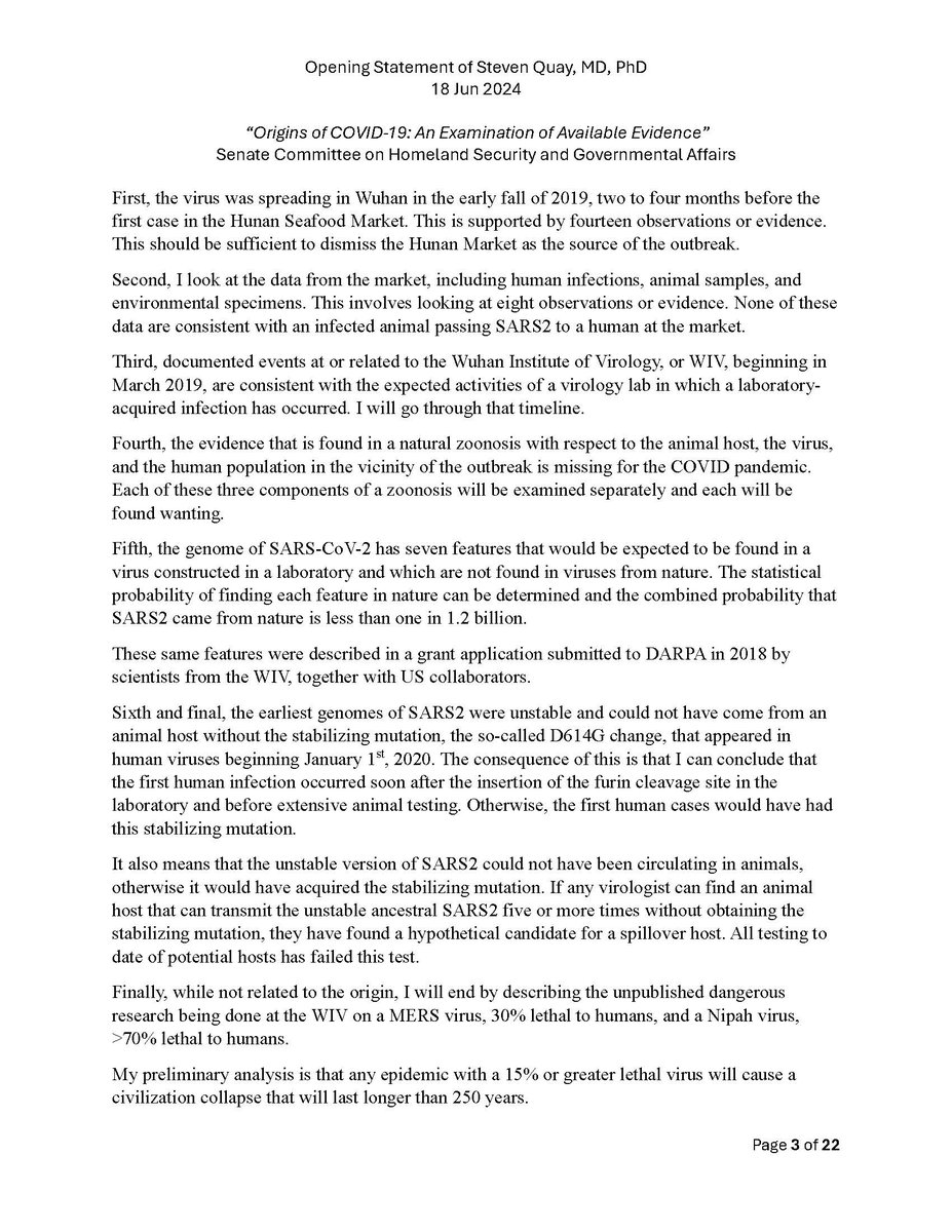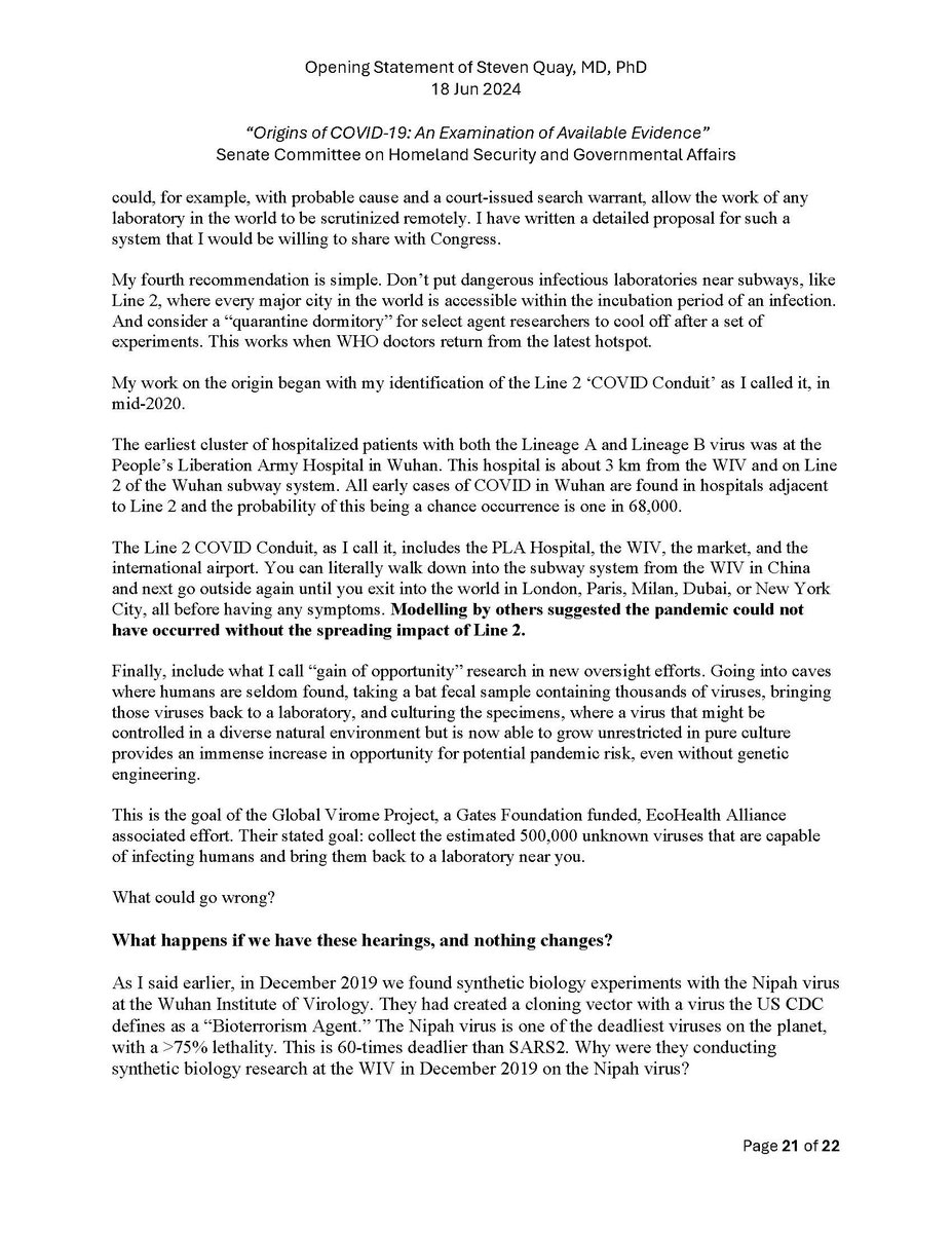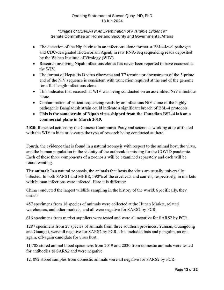 Here is my submitted testimony for the hearing today. I approach the question of the origin with six 'Russian nesting dolls' of evidence, all supporting a lab-acquired infection. 14 sets of data document the outbreak began months before the market cases 8 observations from the market data not c/w a spillover. A timeline of events at the WIV over six months c/w a lab reacting to a biosafety breech. Data from a zoonosis with respect to animals, people, and viruses never seen with a spillover. 8 genome features c/w a synthetic virus. Probability one virus from nature has all of these features is one in 1.2 billion. 9 features described in the 2018 DEFUSE grant are found in SARS2. The D614 unstable ancestor virus first seen in humans cannot passage in any animal without the D614G stabilization. Means the FCS was added last and infected a lab worker almost immediately and before animal passaging. Otherwise the first human cases would be D614G. Next potential lab leak? The Nipah virus, 75% lethal, Here is a pdf of my Statement: https://zenodo.org/records/12082166