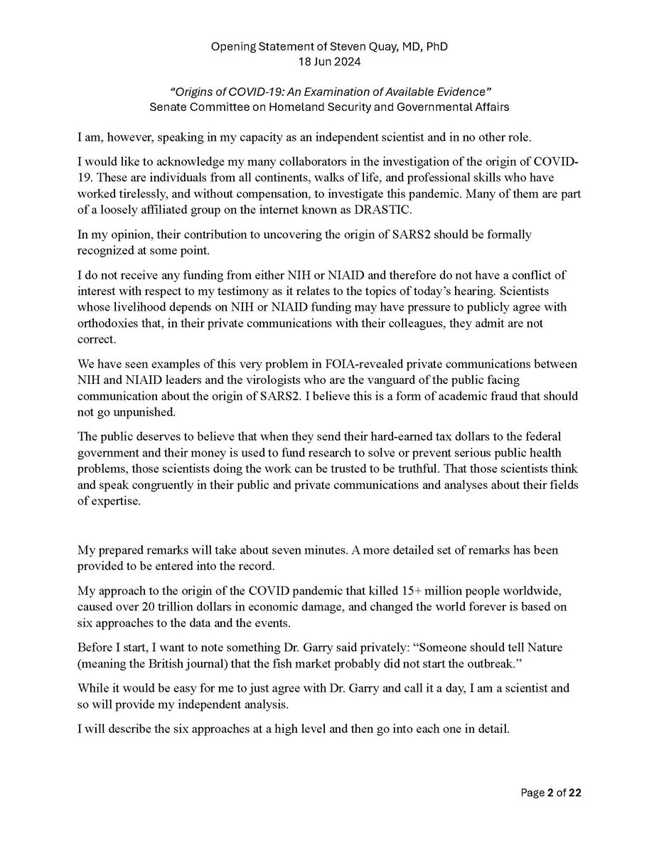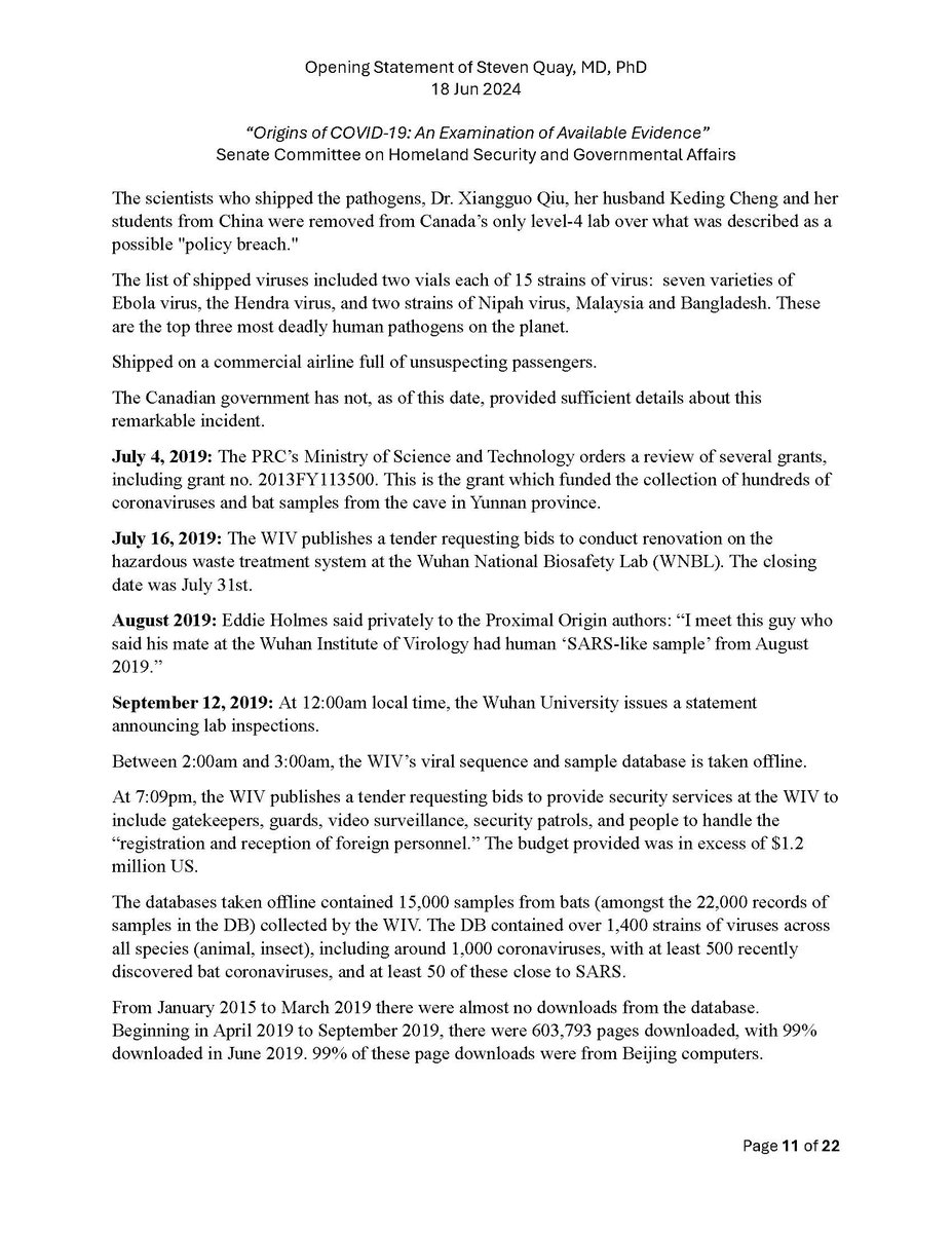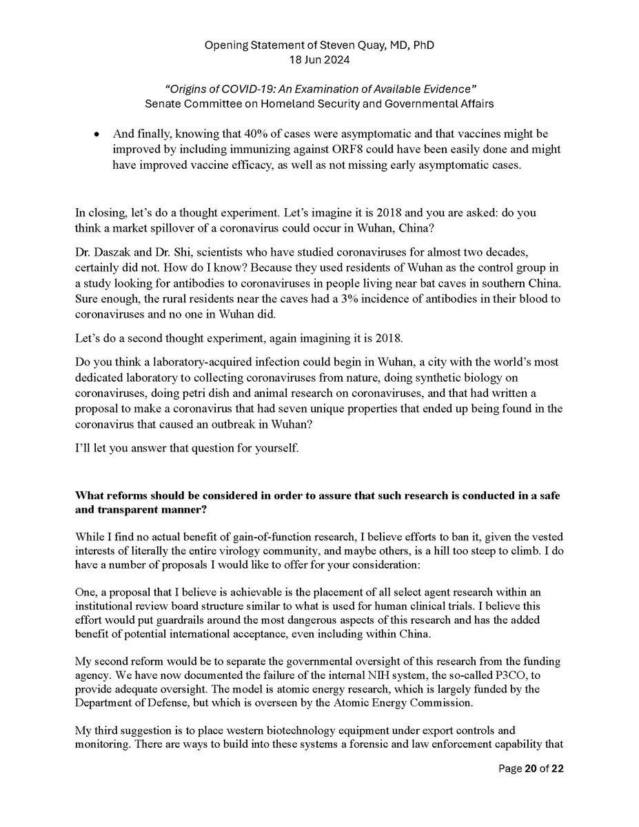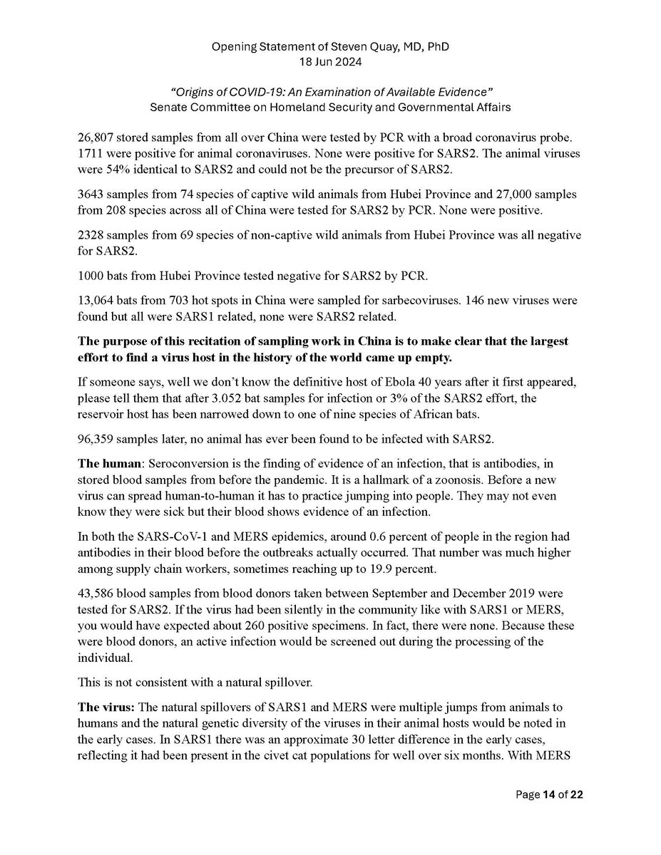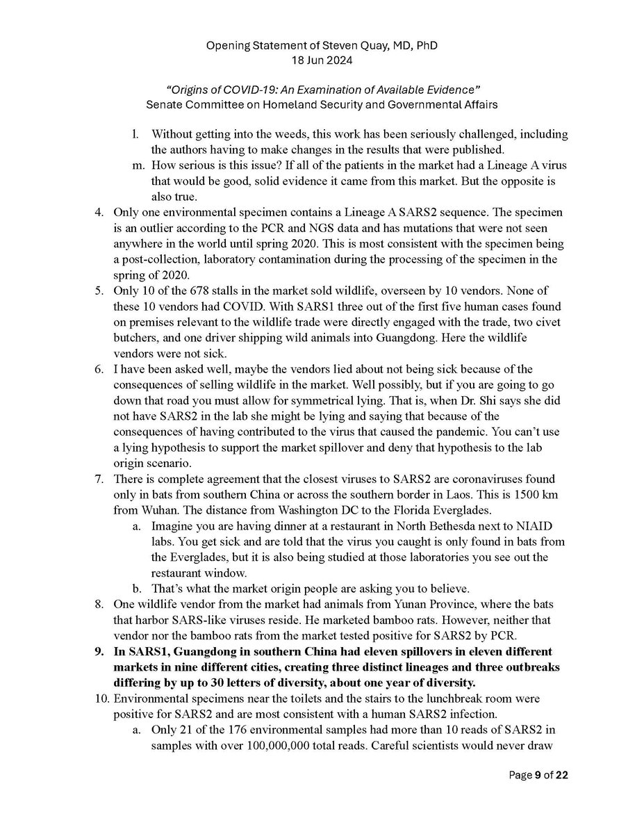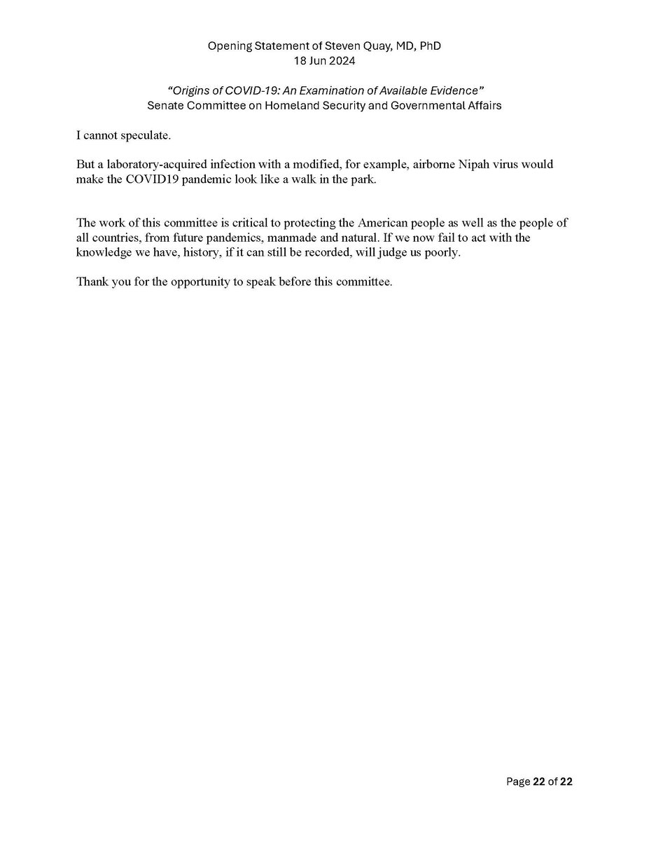 Here is my submitted testimony for the hearing today. I approach the question of the origin with six 'Russian nesting dolls' of evidence, all supporting a lab-acquired infection. 14 sets of data document the outbreak began months before the market cases 8 observations from the market data not c/w a spillover. A timeline of events at the WIV over six months c/w a lab reacting to a biosafety breech. Data from a zoonosis with respect to animals, people, and viruses never seen with a spillover. 8 genome features c/w a synthetic virus. Probability one virus from nature has all of these features is one in 1.2 billion. 9 features described in the 2018 DEFUSE grant are found in SARS2. The D614 unstable ancestor virus first seen in humans cannot passage in any animal without the D614G stabilization. Means the FCS was added last and infected a lab worker almost immediately and before animal passaging. Otherwise the first human cases would be D614G. Next potential lab leak? The Nipah virus, 75% lethal, Here is a pdf of my Statement: https://zenodo.org/records/12082166