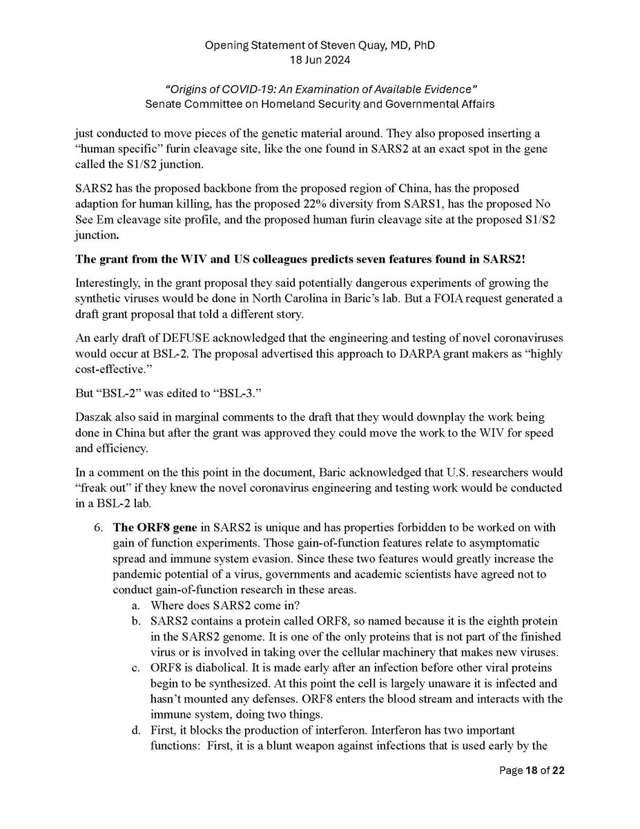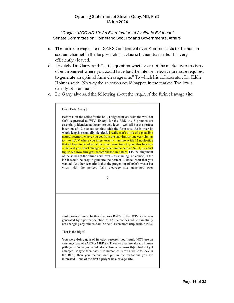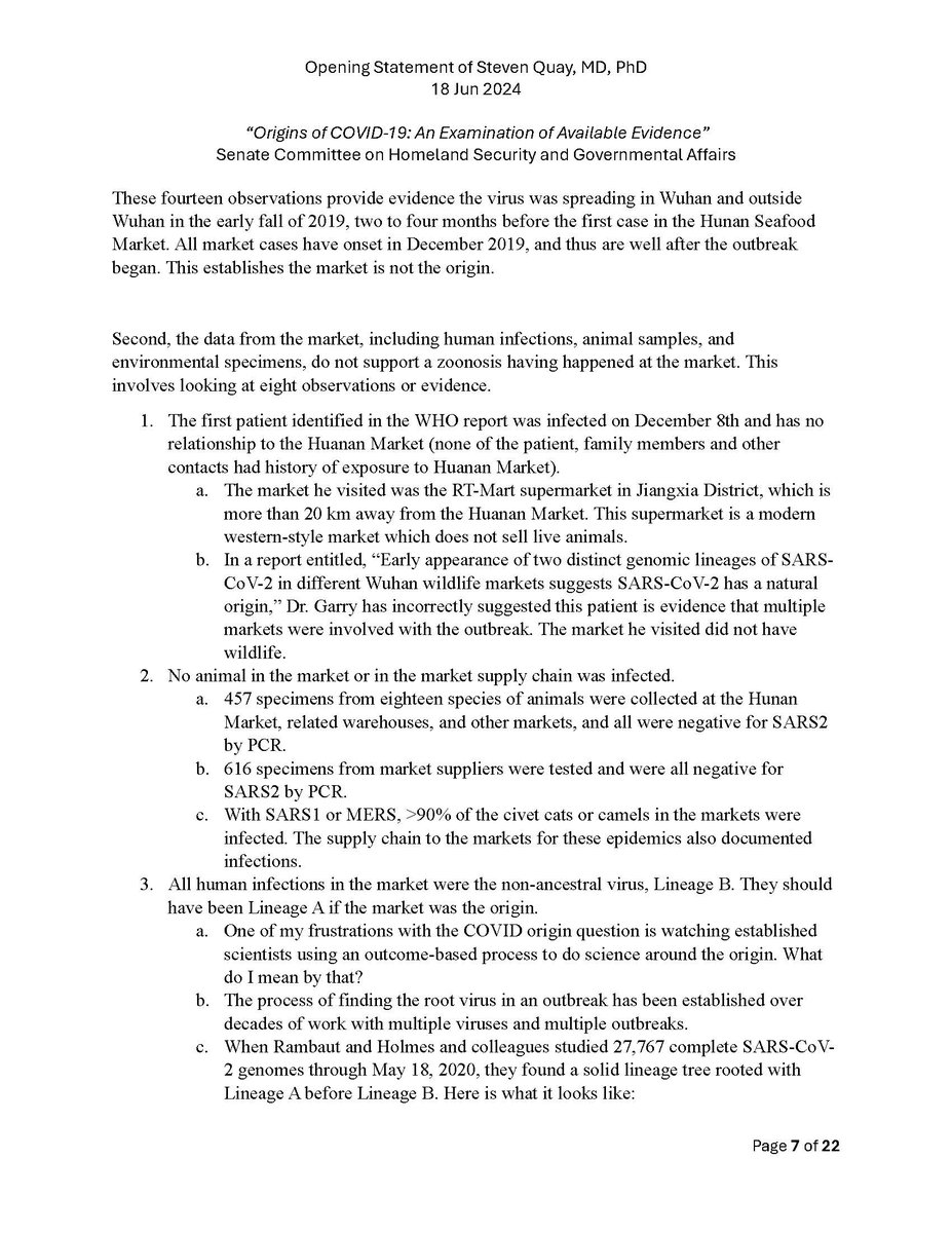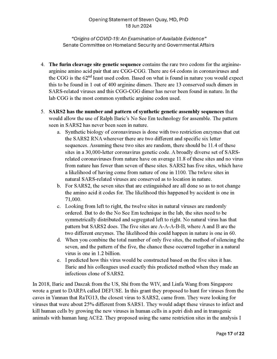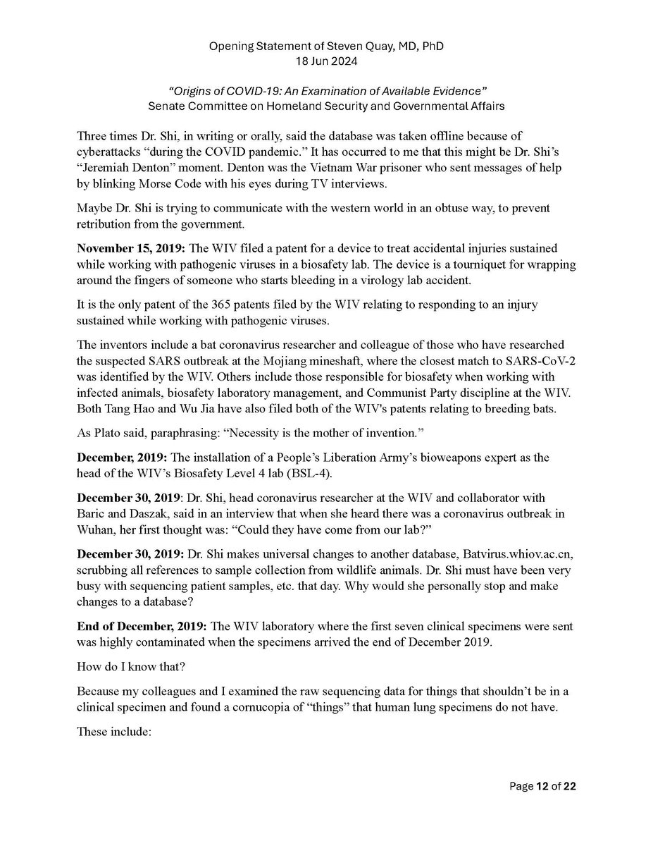 Here is my submitted testimony for the hearing today. I approach the question of the origin with six 'Russian nesting dolls' of evidence, all supporting a lab-acquired infection. 14 sets of data document the outbreak began months before the market cases 8 observations from the market data not c/w a spillover. A timeline of events at the WIV over six months c/w a lab reacting to a biosafety breech. Data from a zoonosis with respect to animals, people, and viruses never seen with a spillover. 8 genome features c/w a synthetic virus. Probability one virus from nature has all of these features is one in 1.2 billion. 9 features described in the 2018 DEFUSE grant are found in SARS2. The D614 unstable ancestor virus first seen in humans cannot passage in any animal without the D614G stabilization. Means the FCS was added last and infected a lab worker almost immediately and before animal passaging. Otherwise the first human cases would be D614G. Next potential lab leak? The Nipah virus, 75% lethal, Here is a pdf of my Statement: https://zenodo.org/records/12082166