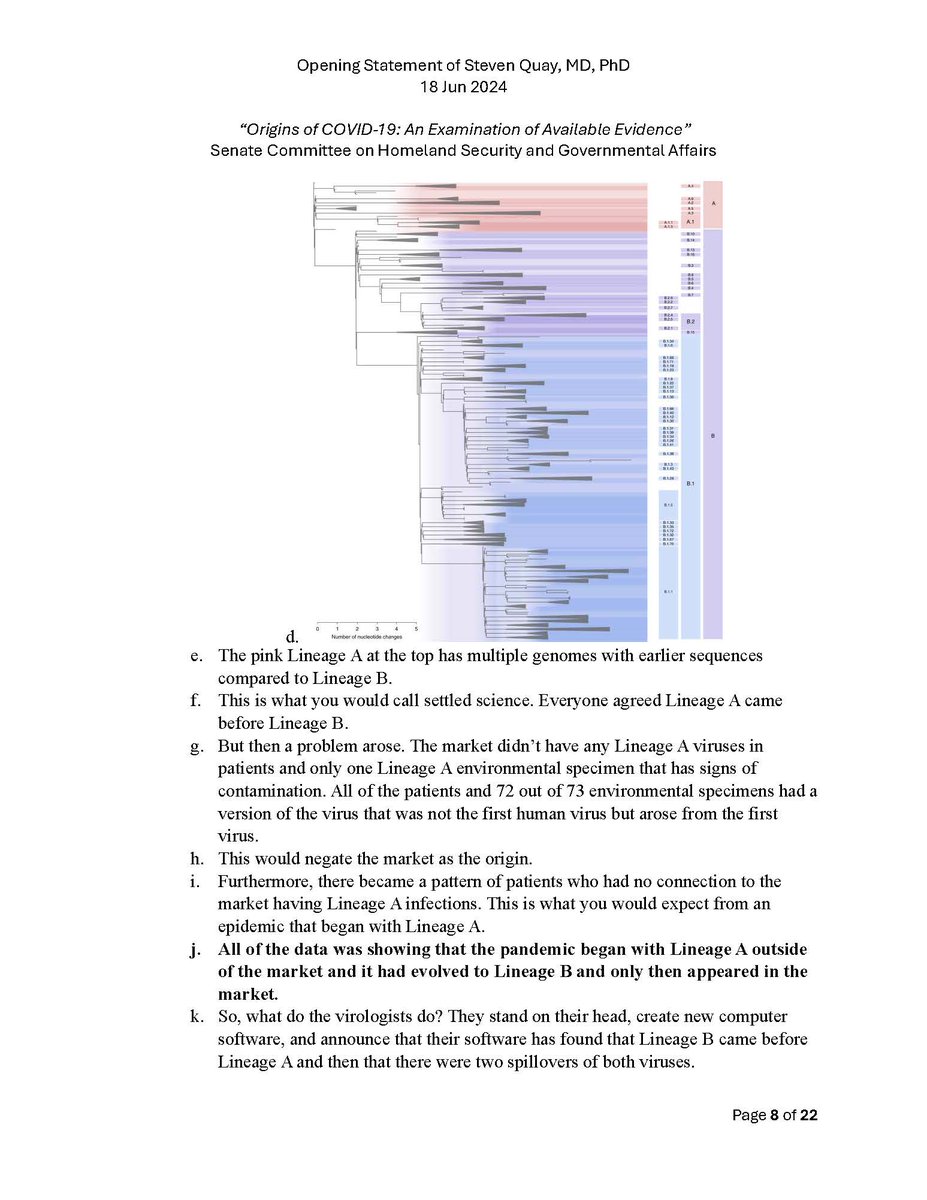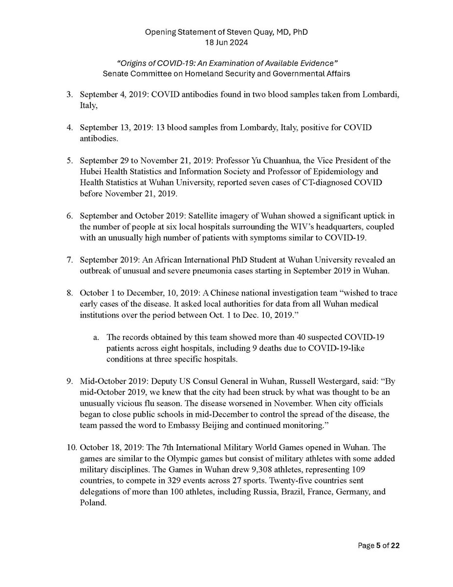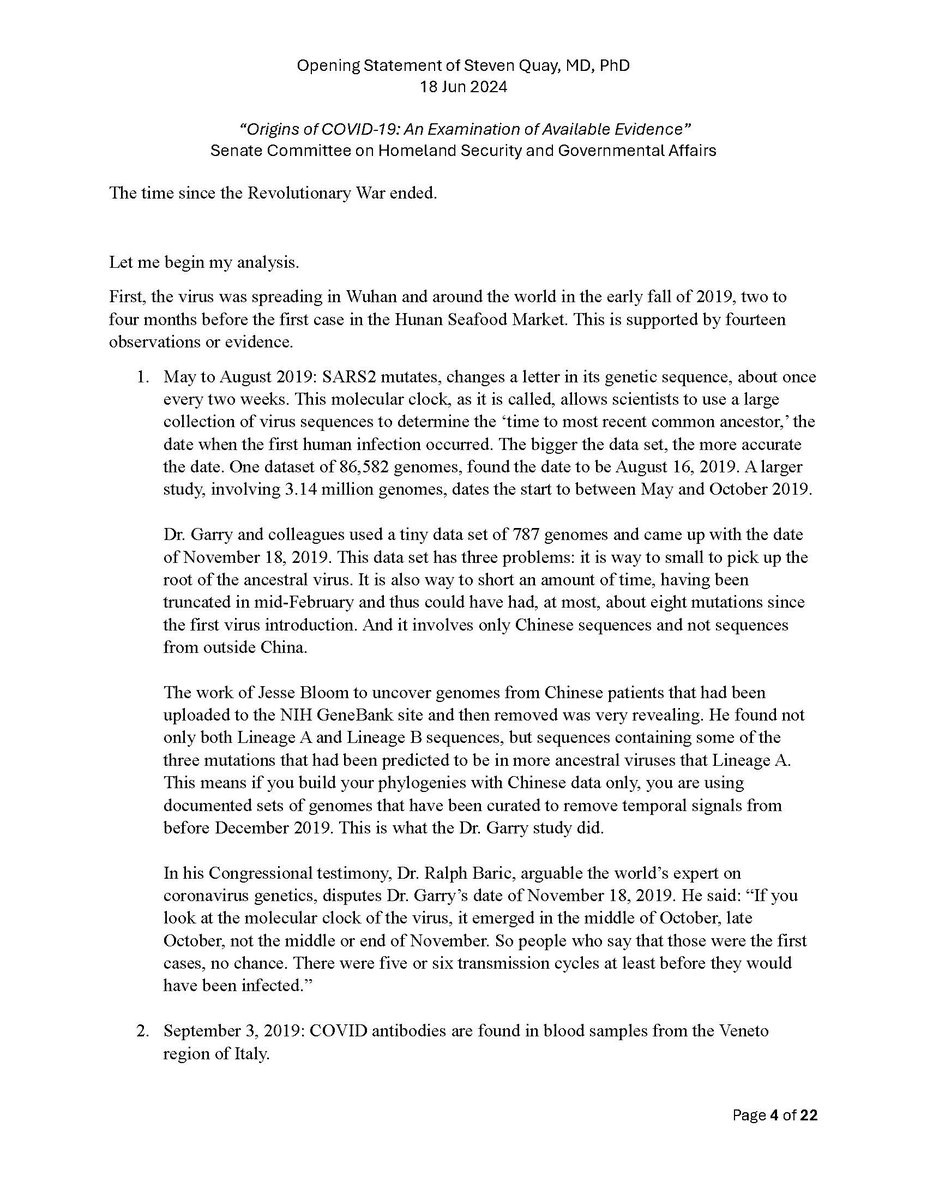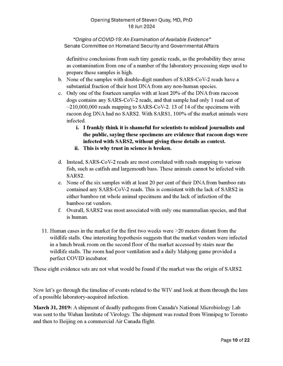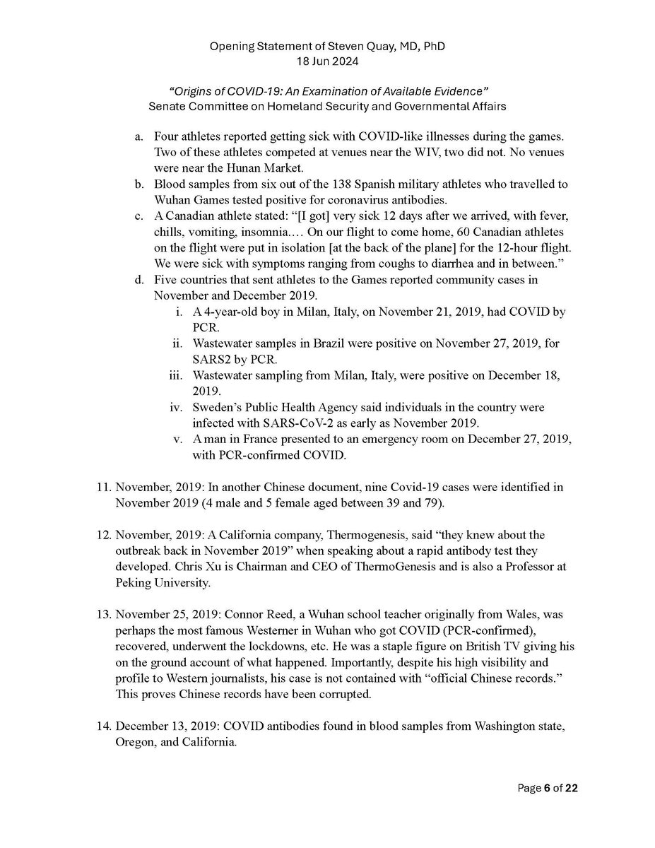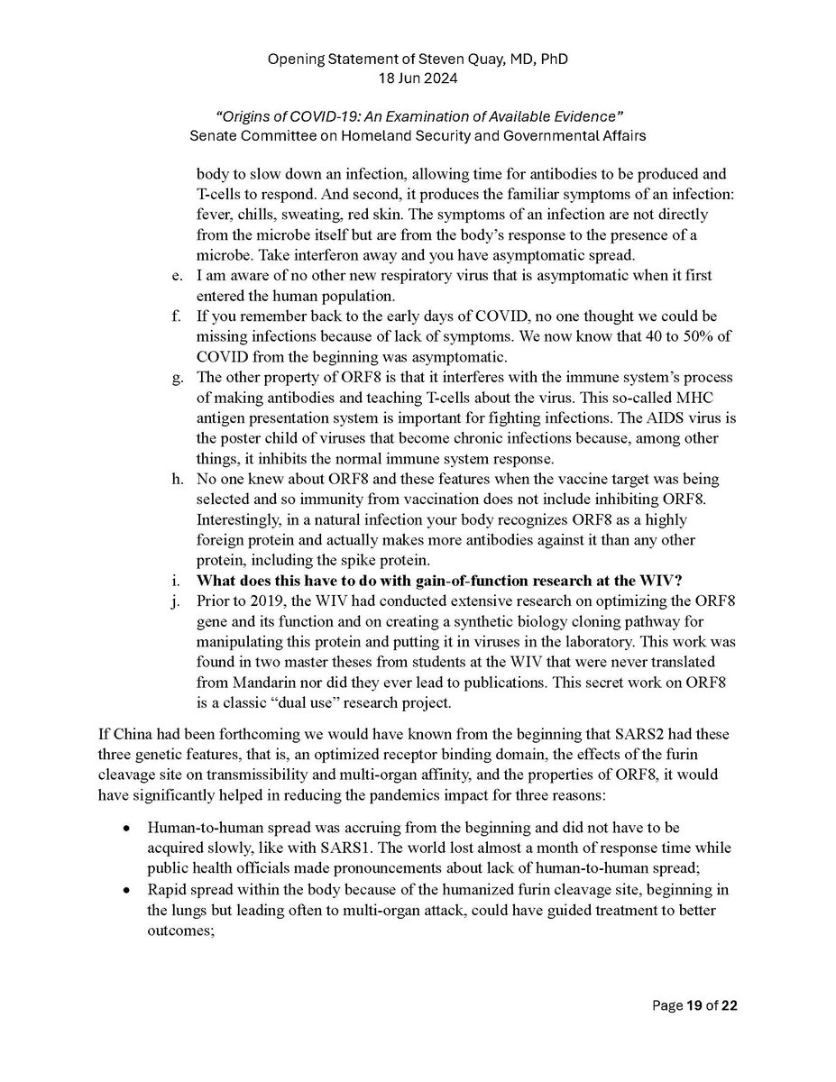 Here is my submitted testimony for the hearing today. I approach the question of the origin with six 'Russian nesting dolls' of evidence, all supporting a lab-acquired infection. 14 sets of data document the outbreak began months before the market cases 8 observations from the market data not c/w a spillover. A timeline of events at the WIV over six months c/w a lab reacting to a biosafety breech. Data from a zoonosis with respect to animals, people, and viruses never seen with a spillover. 8 genome features c/w a synthetic virus. Probability one virus from nature has all of these features is one in 1.2 billion. 9 features described in the 2018 DEFUSE grant are found in SARS2. The D614 unstable ancestor virus first seen in humans cannot passage in any animal without the D614G stabilization. Means the FCS was added last and infected a lab worker almost immediately and before animal passaging. Otherwise the first human cases would be D614G. Next potential lab leak? The Nipah virus, 75% lethal, Here is a pdf of my Statement: https://zenodo.org/records/12082166