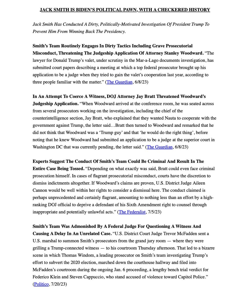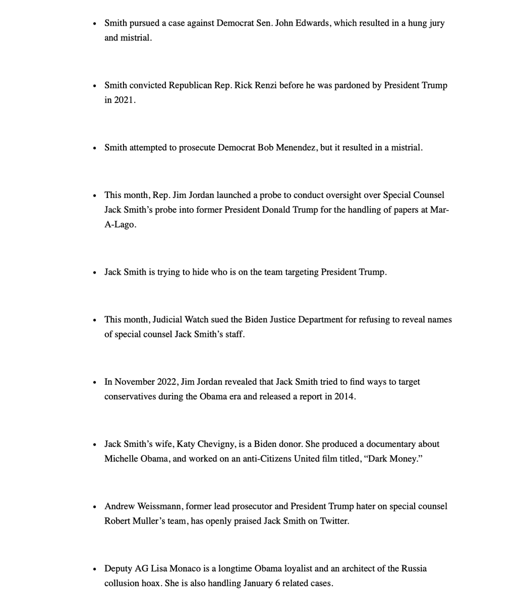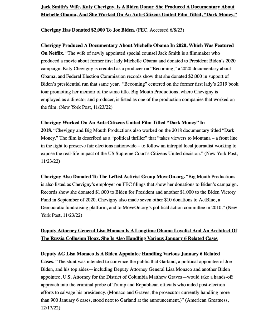 Jack Smith’s wife is a Biden donor and produced fawning Michelle Obama documentary Deputy AG Lisa Monaco is also Obama loyalist and Russiagate Architect which tried to frame President Trump for Russia “collusion” Smith worked at the corrupt International Criminal Court