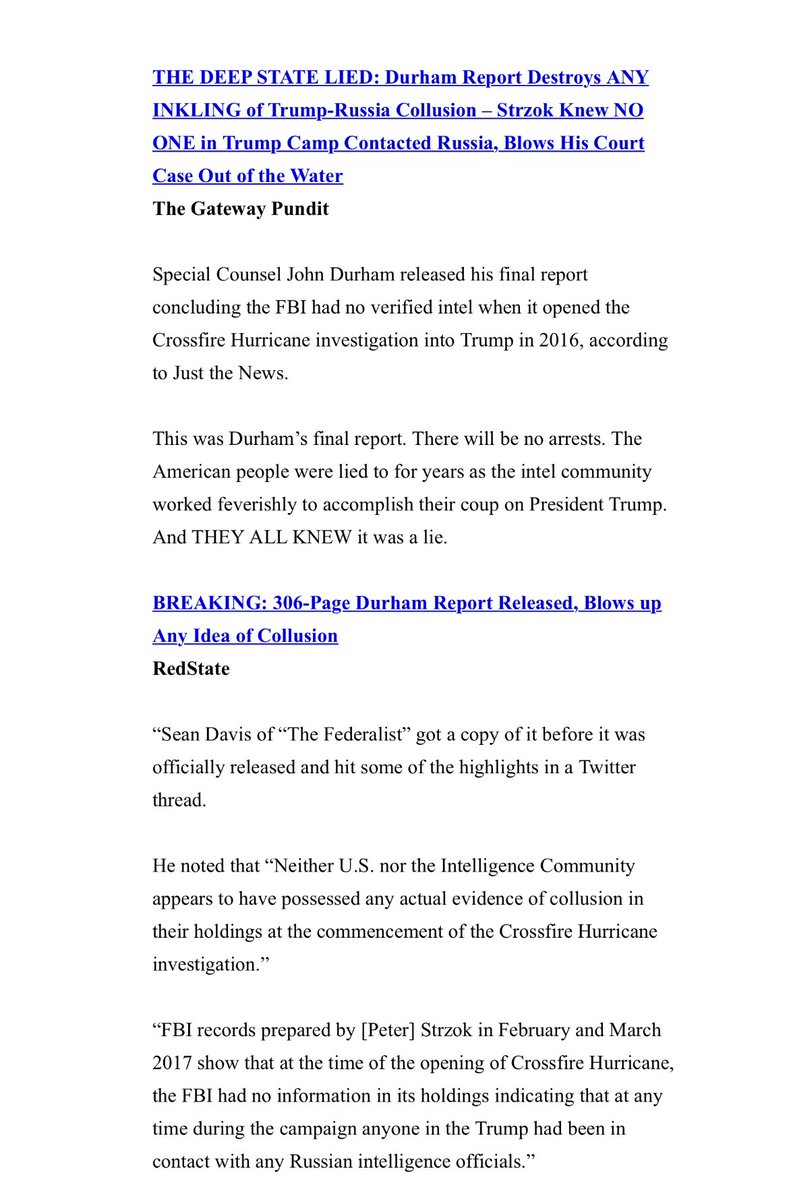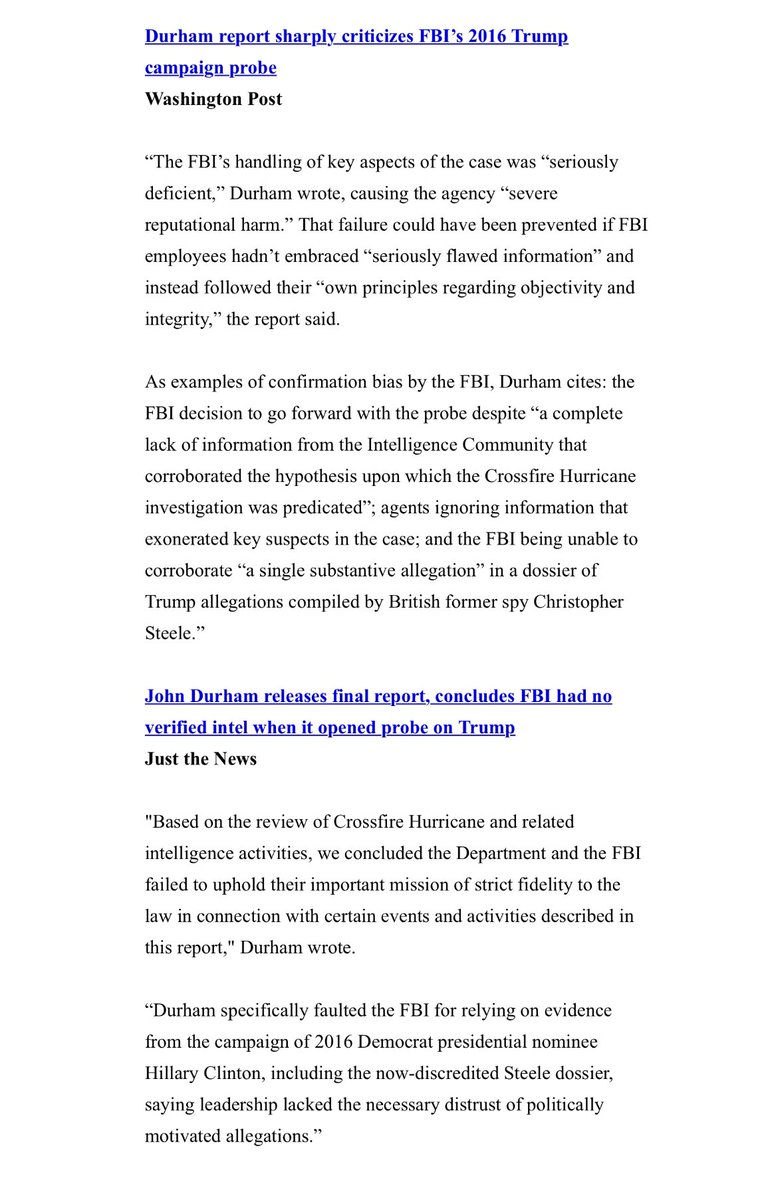 John Durham releases final report, concludes FBI had no verified intel when it opened probe on Trump https://justthenews.com/accountability/russia-and-ukraine-scandals/john-durham-releases-final-report-concluding-fbi-had-no