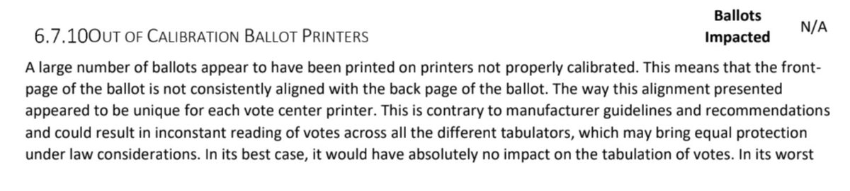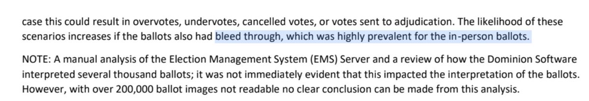 Bleed through was "highly prevalent" for in-person Election Day ballots (voters who favored President Trump) This affected an unknown number of ballots, and "over 200,000 ballot images [were] not readable" The 50,000 illegal ballots is the minimum amount of fraud, not the max https://t.co/3GnDqyGTQN