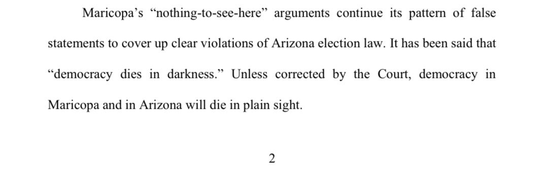 “Maricopa’s ‘nothing-to-see-here’ arguments continue its pattern of false statements to cover up clear violations of AZ election law. It has been said that ‘democracy dies in darkness.’ Unless corrected by the Court, democracy in Maricopa and in Arizona will die in plain sight.” https://t.co/68fryVN0ek