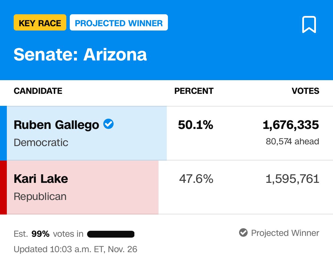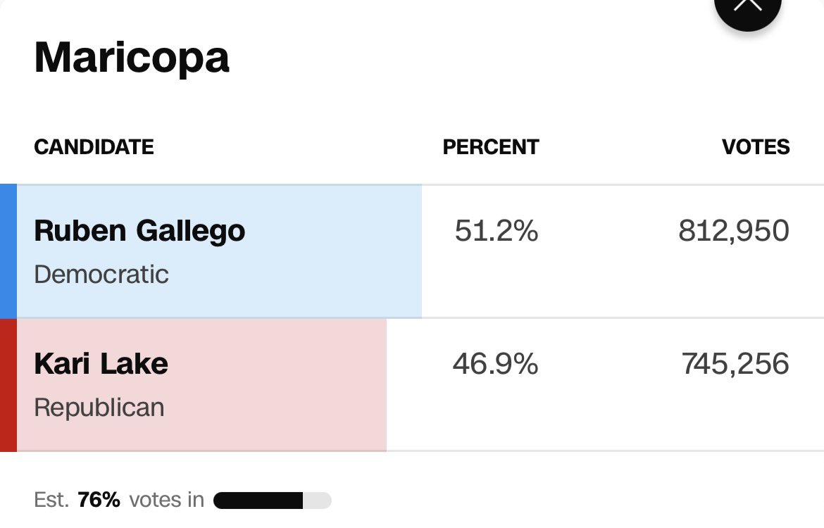 The results in Arizona are ridiculous. They kept Gallego below Trump but 80K votes above Lake. Lake is extremely tied to Trump who crushed Harris by 5.5 points https://t.co/GFNwKZ0FMp