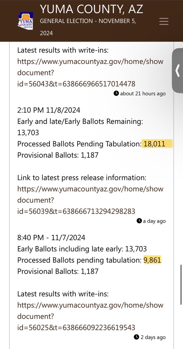 🚨🚨Yuma County Adding Votes🚨🚨 Outstanding votes almost DOUBLED from 11/7 to 11/8 How does Yuma go from 9,861 votes left to 18,011? And how is it Saturday night after the Election and we still don’t have the “results”? Because they’re stealing it from @KariLake! https://t.co/rbyjHOS1JM