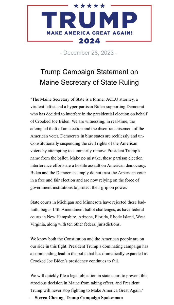 “The Maine Secretary of State is…a virulent leftist hyper-partisan…who has decided to interfere in the presidential election on behalf of Crooked Joe Biden. We are witnessing, in real-time, the attempted theft of an election and disenfranchisement of the American voter.” https://t.co/gNcueiLYSc