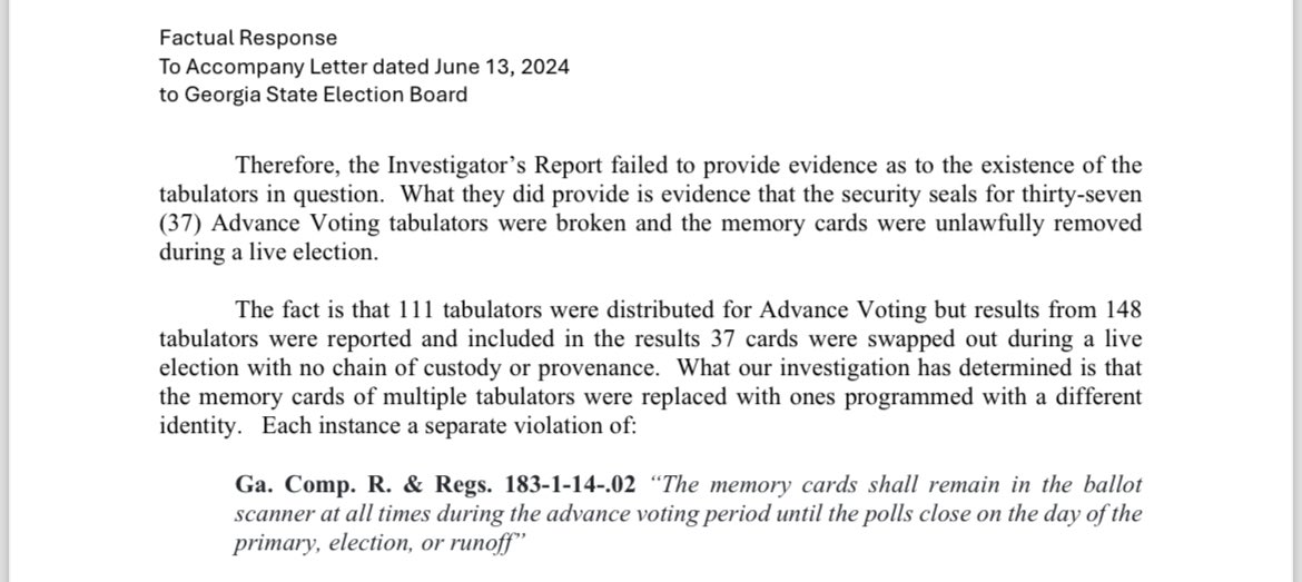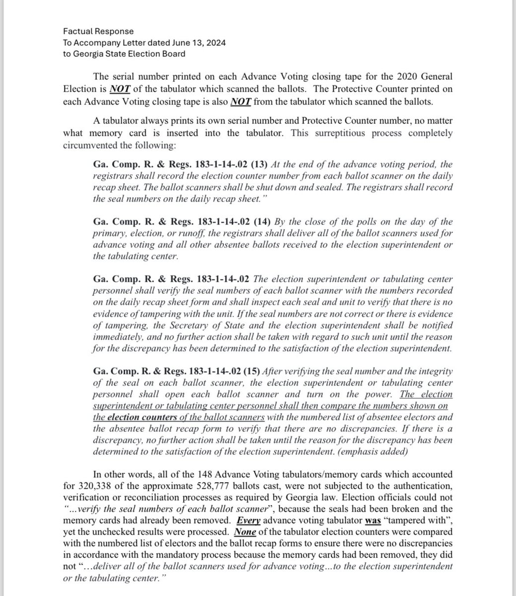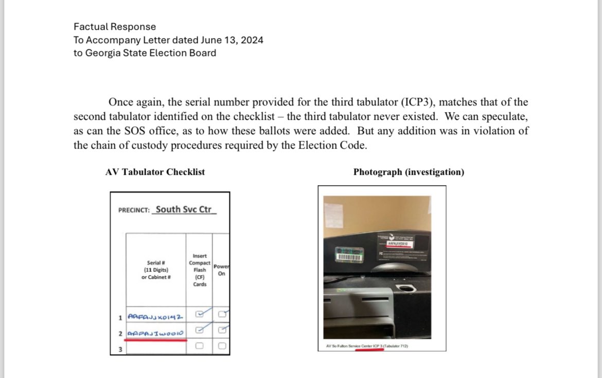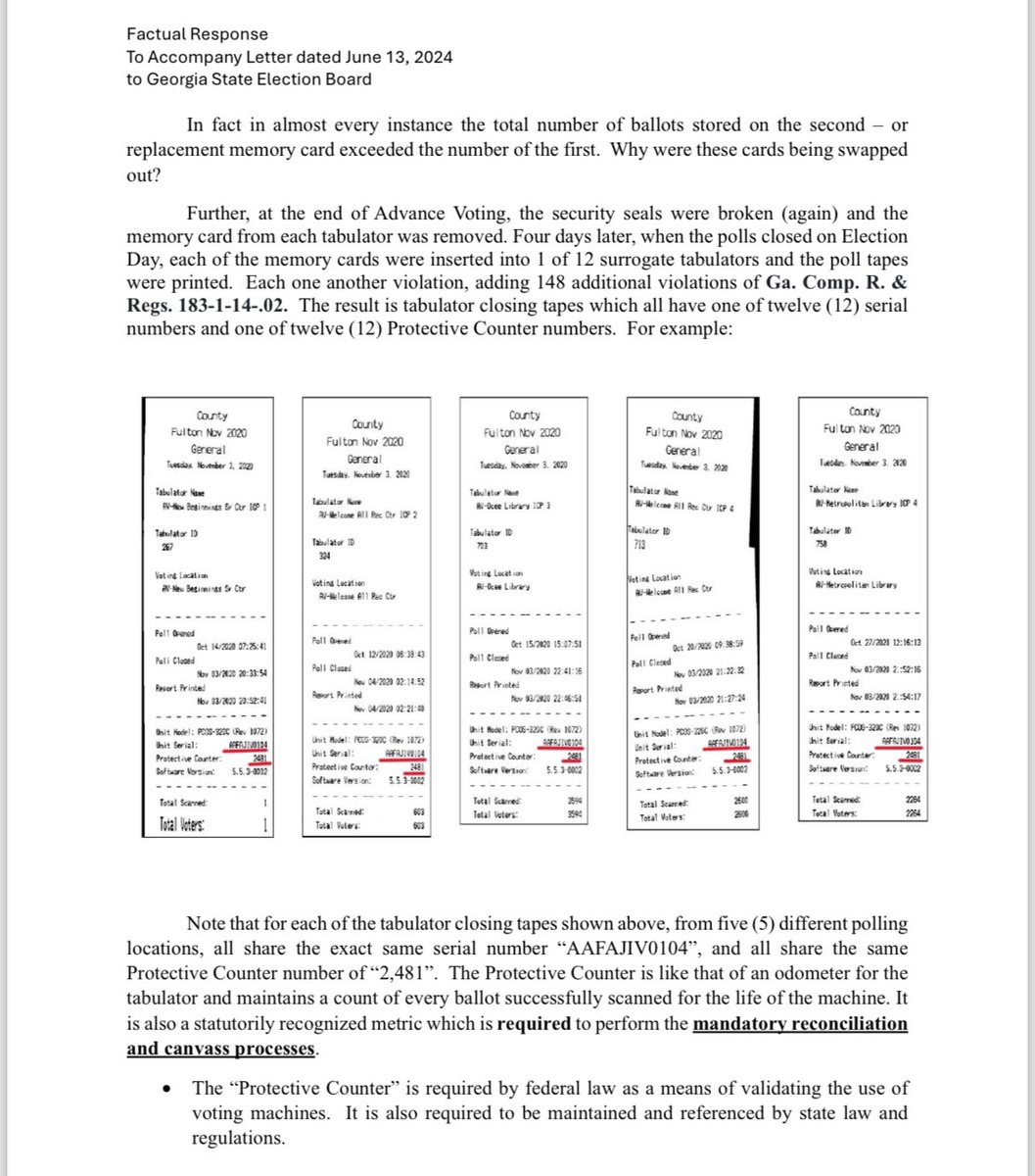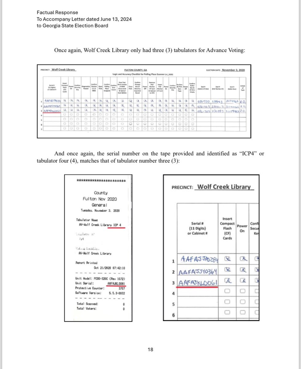 There are over 20K unsubstantiated ballots in GA’s 2020 original results from tabulators that “do not exist” according to the Rossi/@KevinMoncla complaint. Fulton County provided “proof” they exist. Except their proof showed they used serial numbers for DIFFERENT machines. There’s a word for this... Oh yes, fraud.