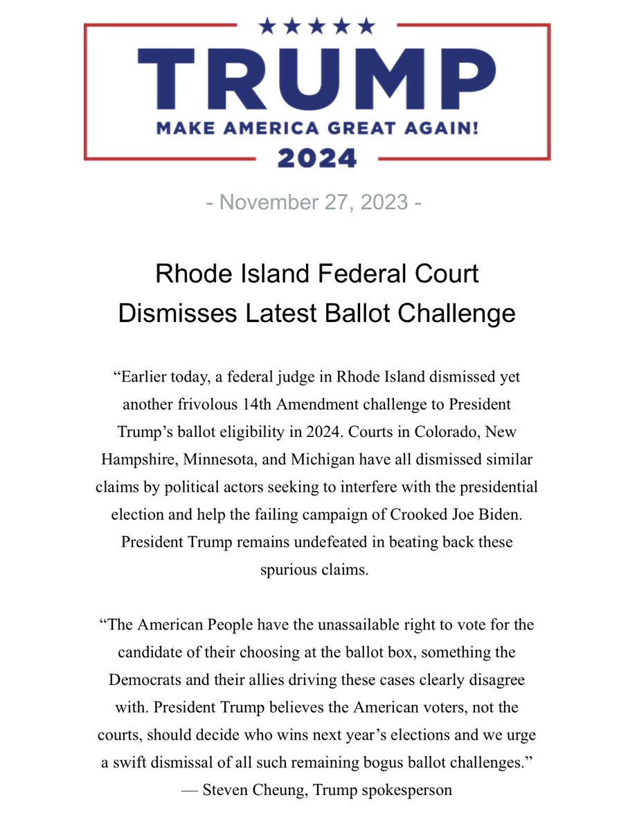 Rhode Island Federal Court Dismisses Latest Ballot Challenge “President Trump believes the American voters, not the courts, should decide who wins next year’s elections and we urge a swift dismissal of all such remaining bogus ballot challenges.” - @TheStevenCheung https://t.co/qgKTncilv8