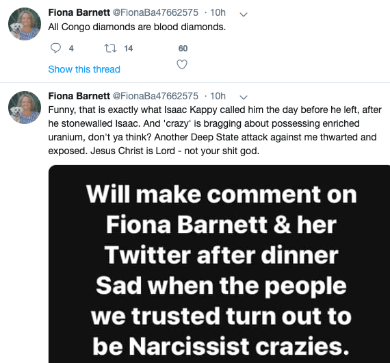 It's here where things got really weird, Fiona & Isaac had a falling out due to a number of things but mainly due to Isaac's friendship & business ordeals w/ known blood diamond trafficker Peter "Elaihi" Priest, who has been caught lying constantly about what happened.