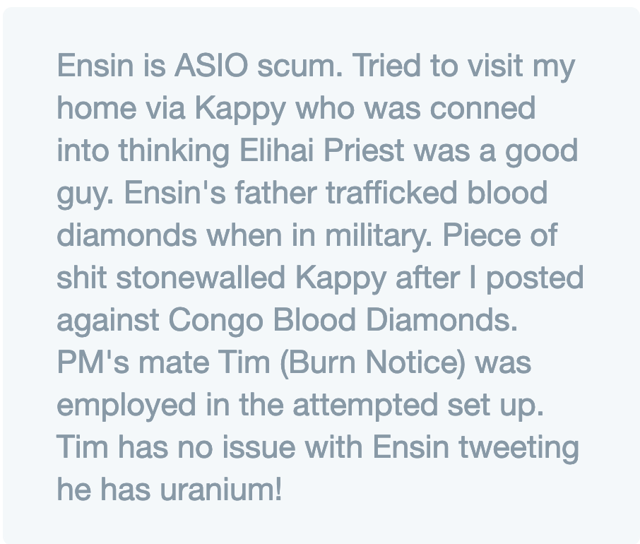 At the time, Fiona suspected Isaac of being connected to the dodgy dossier psychological operation launched against her. Eliahi Priest was part of the “Insignia Gate” operation; he's linked to a number of dodgy events, like claiming he had illegal Uranium in his possession.