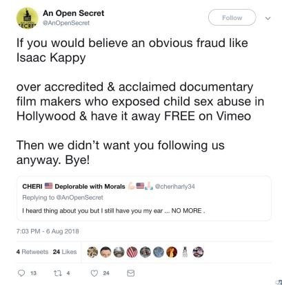 Gabe Hoffman, producer of An Open Secret, mercilessly attacked Isaac on Twitter upon his arrival. He claims to be an advocate for victims of child sex abuse and child trafficking, but spends a huge % of his time online harshly bashing victims & whistle blowers who come forward.