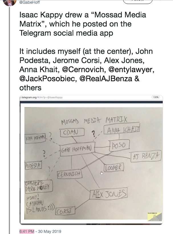 Isaac believed Epstein was controlling all the major pedogate LARPs in what he named the "Mossad Media Matrix" including names like Hoffman, Benza, Loomer, Cernovich, Jones & the Podesta group. He called this Periscope "Brackets & Jackets".
