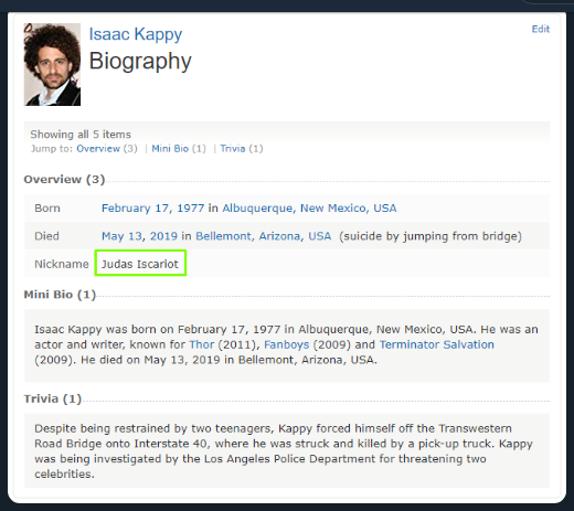 Isaac (2/17/1977-5/13/2019) was an actor, writer, producer & indie musician who came out vs the establishment by denouncing the prevalent pedophilia in Hollywood, the music industry & politics; knowing that by doing this he would get black listed by friends & colleagues alike.