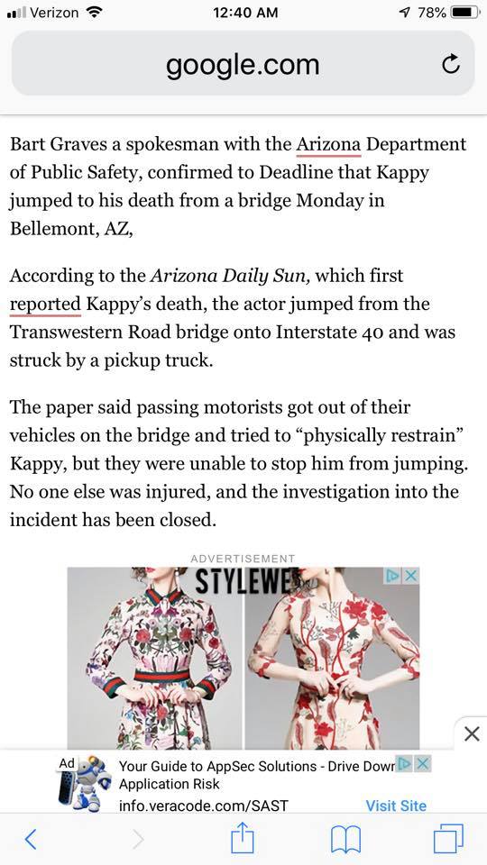 "Authorities said 2 teenagers driving by got out of their vehicle and tried to physically restrain Kappy from jumping, but failed. No one else was injured during the incident and the investigation has been closed." The 20 ft bridge seems like the strangest choice for a suicide.