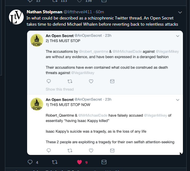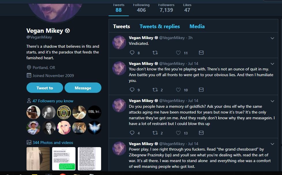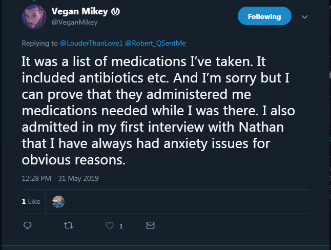I start paying attention to Robert the Deplorable who dissected Michelle & Kayla's behavior accurately. Simultaneously he begins to entrap Vegan Mikey into exposing himself, asking for $ and names in exchange for publishing Isaac's dead man's switch, which he never publishes.