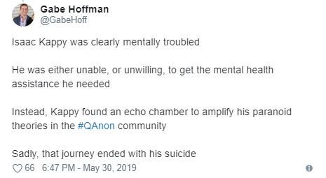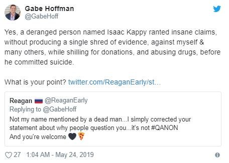 Gabe Hoffman, an avid detractor of both Isaac & Mikey suddenly decided to intervene in something that wasn't his business, claiming Robert & me were insane for saying Mikey might had been involved. Hoffman flip flops worst than Hillary, figures why his family are avid HRC fans.