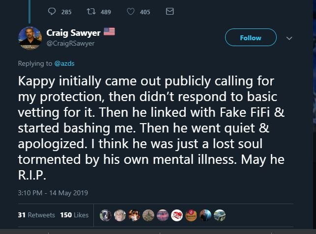I personally believe Kappy was set up for murder by the MEGA group (Wexner, Epstein, Spielberg), as the financial arm of Mossad, they hired Elaihi Priest as a mercenary via Gabe Hoffman & Craig Sawyer. Mikey sold out for the $18K+ BTC Priest had kept from Kappy to get it done.
