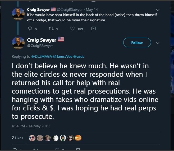 Craig Sawyer being a LARP based in AZ & a trained killer might have been involved, at the very least he was deflecting & informed just like Defango, Lestat, Unirock & all the other cretins who are out there still to this day trying to dox, entrap & confuse whoever is researching.