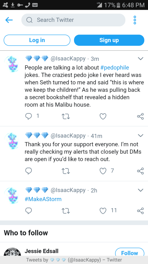 Isaac posted on Twitter: “People are talking a lot about #pedophile jokes. The craziest pedo joke I ever heard was when Seth turned to me and said ‘this is where we keep the children!’ As he was pulling back a secret bookshelf that revealed a hidden room at his Malibu house.”