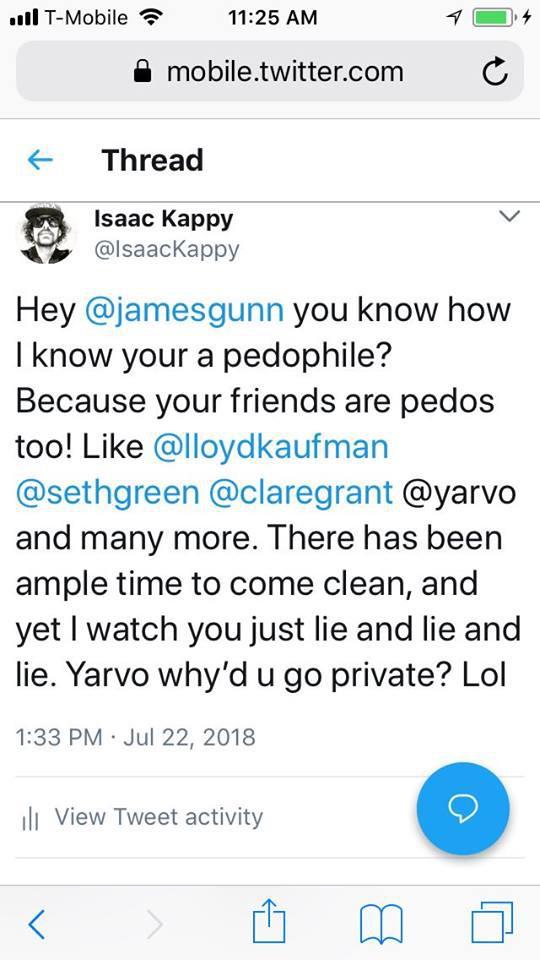 The “#pedophile jokes” Isaac was referring to included the massive collection of pedo-laced tweets that resurfaced from Guardians of the Galaxy director James Gunn, as well as questionable tweets from other major players in Hollywood that Mossad shill Mike Cernovich "exposed".