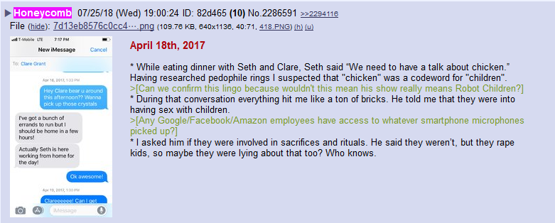 Issac said Seth Green invited him to join the Illuminati in 2018, stating that he would be given "$250K a year & any car that he wanted". This after a dinner party w/ the couple where Green told Isaac that they "needed to talk about chicken". Pedo slang for very young children.