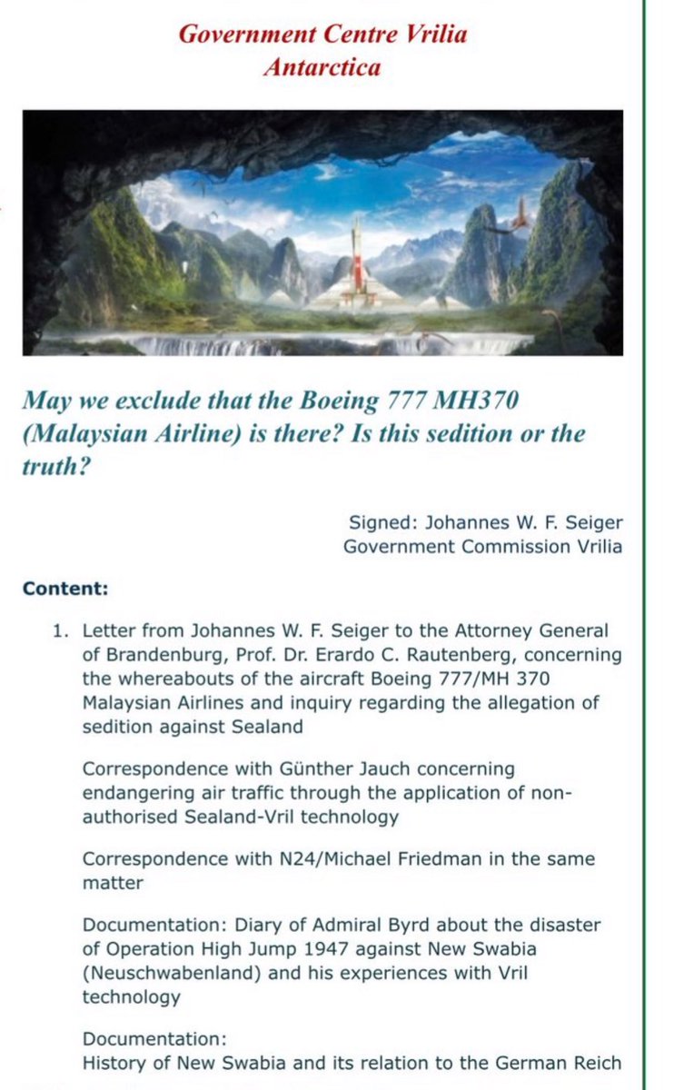 🗻 “𝐆𝐨𝐯𝐞𝐫𝐧𝐦𝐞𝐧𝐭 𝐂𝐞𝐧𝐭𝐫𝐞 𝐕𝐫𝐢𝐥𝐢𝐚 𝐀𝐧𝐭𝐚𝐫𝐜𝐭𝐢𝐜𝐚 May we exclude that the Boeing 777 MH370 (Malaysian Airline) is there? Is this sedition or the truth? … 𝗠𝗮𝘆 𝟴𝘁𝗵, 𝟭𝟵𝟰𝟱 The German Reich never capitulated, only the three Wehrmacht sections did”