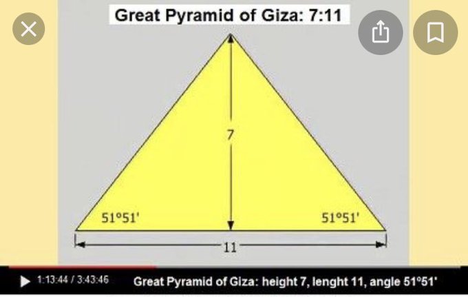 For the Great Pyramid to "Square the Circle" everything has to be precise and ultimately achieved with a 51-degree slope. Where have we seen 51 in this Thread? F-r-o-d-o Note that the height and base ratio is 7:11. September (7th month) 11th was marked as the New Year in Ancient Egypt.