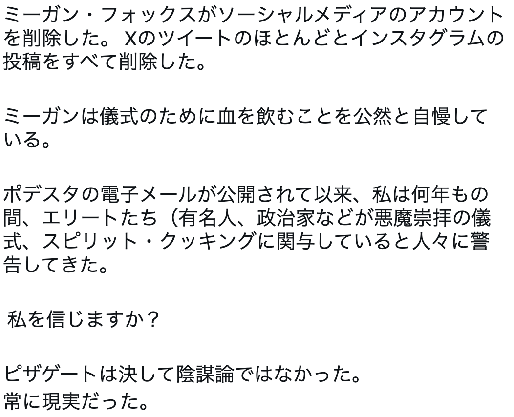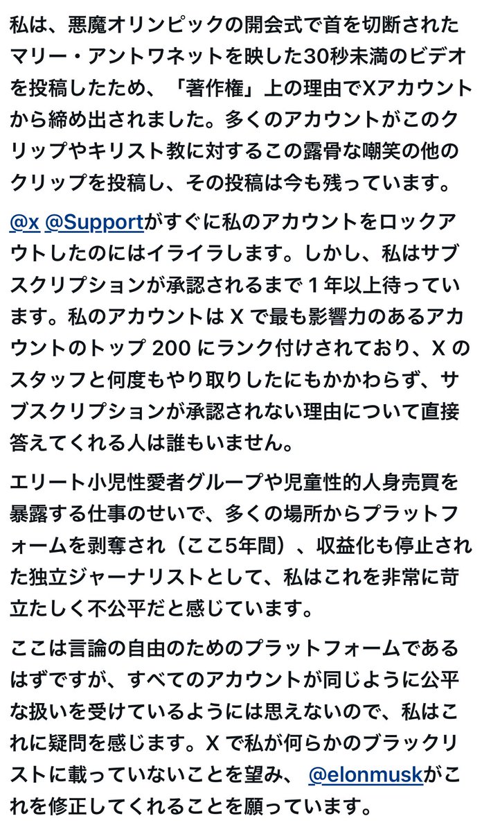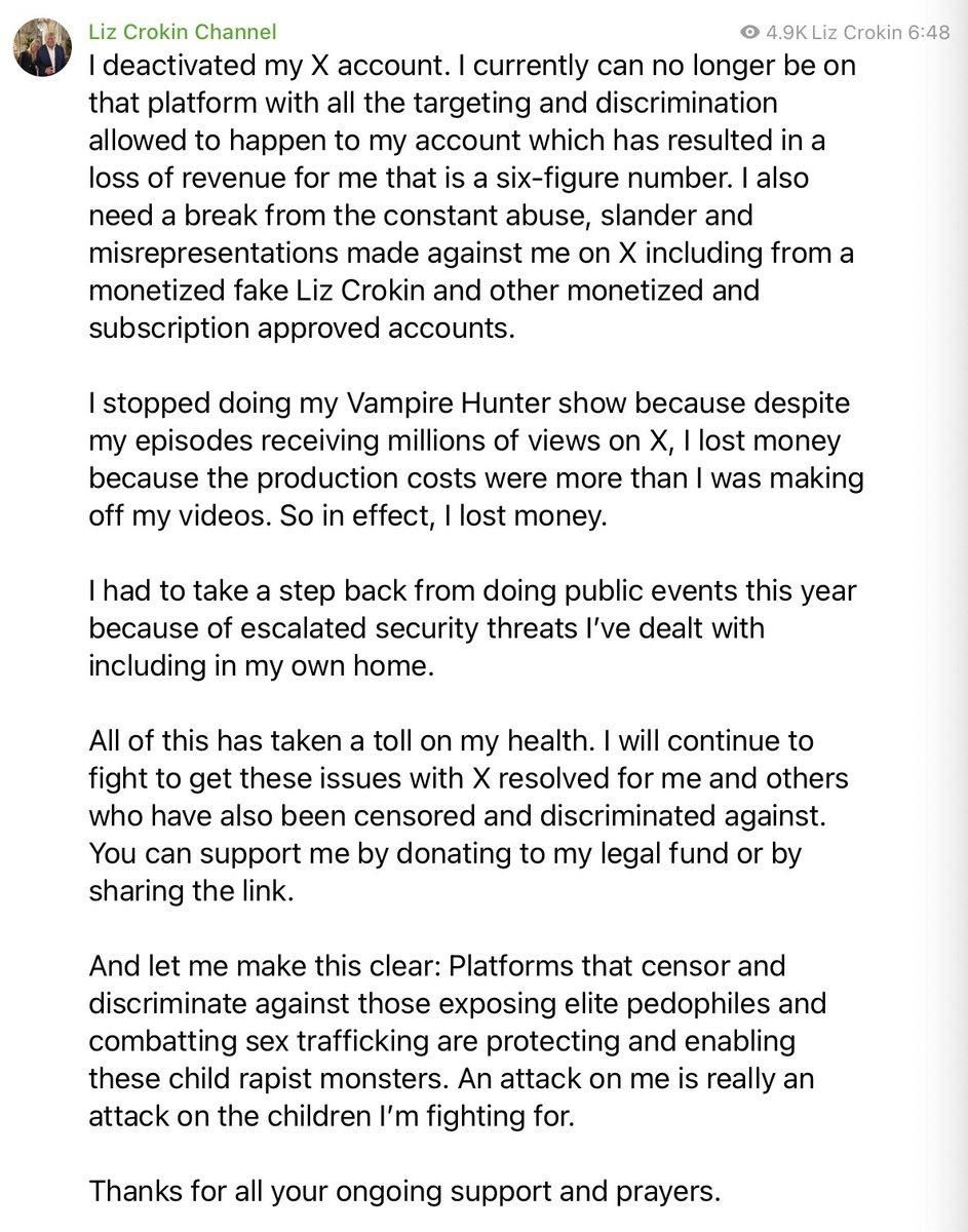 リズ・クロッキンさんのXアカウントが消滅しました❣️🐸🍿 👇 私はXアカウントを無効化しました。現在、私のアカウントに対して行われるあらゆるターゲティングや差別により、6桁の収益の損失が発生しているため、私はそのプラットフォームにもう参加できません。 また、Xで私に対して行われる絶え間ない虐待、中傷、虚偽の表現からも解放される必要があります。これには、収益化された偽のLiz Crokinやその他の収益化およびサブスクリプション承認されたアカウントも含まれます。 私はヴァンパイアハンターショーをやめました。Xで私のエピソードが何百万回も視聴されたにもかかわらず、制作費が動画で稼いでいた金額を上回ったため、お金を失ったからです。つまり、実質的にお金を失ったのです。 今年は、自宅を含め、対処してきたセキュリティの脅威がエスカレートしたため、公のイベントから一歩後退しなければなりませんでした。 これらすべてが私の健康を害しました。 私は、検閲や差別を受けた私や他の人々のために、Xのこれらの問題を解決するために戦い続けます。私の法的基金に寄付するか、リンクを共有することで、私を支援することができます。 そして、はっきりさせておきたいのは、エリート小児性愛者を暴露し、性的人身売買と闘う人々を検閲し、差別するプラットフォームは、これらの児童レイプの怪物を保護し、助長しているということです。 私への攻撃は、私が戦っている子供たちへの攻撃なのです。 皆さんの継続的な支援と祈りに感謝します。 givesendgo.com/FreeLizCrokin https://t.me/LizCrokinReport/2090