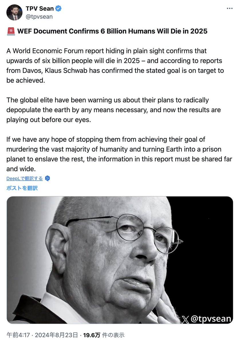 こんな情報がありました❣️🐸🍿 #保留推奨🌸🐰🌸 👇 WEFの文書、2025年に60億人が死亡することを確認 隠れていた世界経済フォーラムの報告書で、2025年に60億人以上が死亡することが確認された。 ダボス会議からの報告によると、クラウス・シュワブはこの目標が達成される目標であることを確認したという。 グローバル・エリートたちは、どんな手段を使っても地球を根本的に人口削減させるという計画について警告を発してきたが、今、その結果が目の前で繰り広げられている。 人類の大多数を殺害し、地球を監獄の惑星にして残りを奴隷化するという彼らの目標達成を阻止する望みがあるのなら、この報告書の情報を広く共有しなければならない。