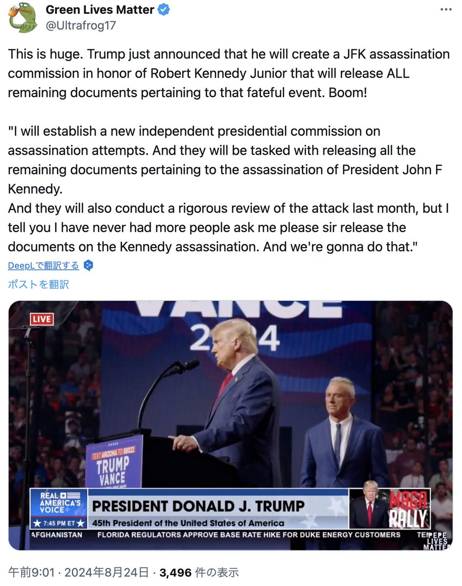 これは大ニュースです。トランプ大統領は、ロバート・ケネディ・ジュニアに敬意を表し、JFK暗殺委員会を創設し、あの運命的な出来事に関連する残りの文書をすべて公開すると発表しました。ドーン! 「私は暗殺未遂に関する独立した大統領委員会を新設する。そして、ジョン・F・ケネディ大統領暗殺に関連する残された文書をすべて公開することを任務とする。 彼らはまた、先月の攻撃について厳密な検証を行うだろうが、私は、ケネディ暗殺に関する文書を公開してもらいたいと、これほど多くの人々に言われたことはないと語っています。我々はそれを行うでしょう」
