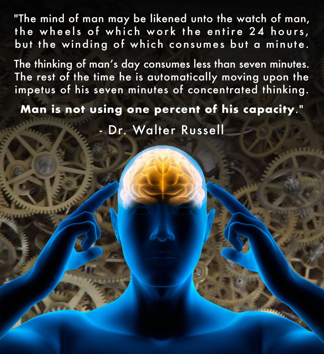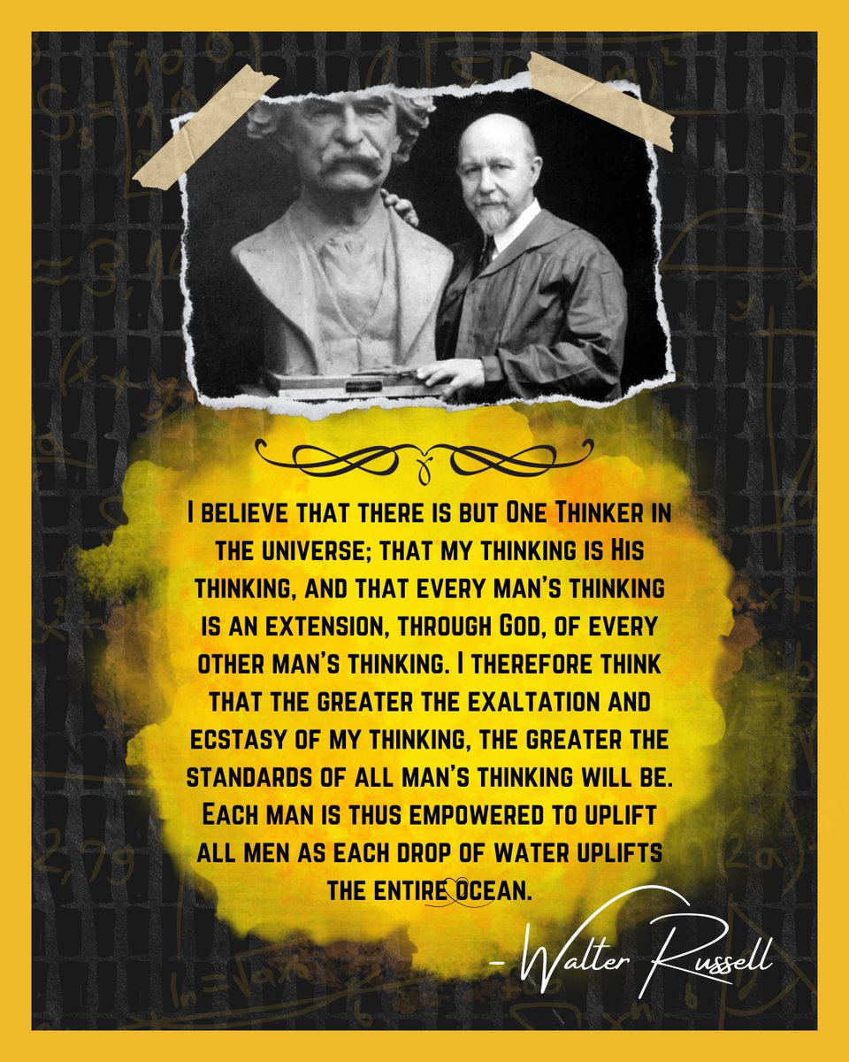 Over the two days... My account has grown by about 2,000 Because of my posts on Walter Russell's work. Academia taught you about Einstein and others. But never about Walter Well, they should have. Here's why he's the most impressive guy... You've never heard of. Most of the conversation around Walter Russell Is because of his work in physics and the sciences. But he was so much more than that. He dominated any field he stepped into, and was a Da Vinci of his time. A true polymath. Born in 1871 Walter Russell was a great. Not because he tapped the secrets of the universe, And discovered the true nature of all things. He was also a master in all of these things: ➥ Composing and Music ➥ Architecture ➥ Philosophy ➥ Humanism ➥ Sculpting ➥ Painting ➥ Science ➥ Writing Without having any schooling above primary grade. So where does his story begin? ——— MUSIC ——— At 13 he was a church organist and by the age of 16... Walter had composed over a hundred melodies. One of which he was invited to play with the Boston Symphony orchestra But watch... it gets better. ————— PAINTING ————— At 19, his illustrations caught the attention of Mark Twain. Which turned into a lifelong friendship that led to him creating the Mark Twain Memorial sculpture decades later. By age 30 he became a master portrait painter and was commissioned for various works for famous people. He also became the official painter for Theodore Roosevelt. As well as the official painter and sculptor for the white house at different points in time. —————— HUMANISM —————— At 24, he became a leader in a great humanist movement started by Herbert Spencer, Ralph Waldo Emerson, Walt Whitman, Andrew Carnegie and others. It was known as the Twilight Club. Which gathered folks who tried to solve the downward trend that society was on. Together with Theodore Roosevelt and other members they instituted the Boy Scouts movement in England and then later in America. Many other projects were born out of the inspiration that Walter contributed to the betterment of society. Including Advertising Censorship, the Better Business Bureau, The Lions Club as well as other service clubs. He also worked with the owner of the New York Times for many years to infiltrate this new idea of humanism and morality into industry. Resulting in significant moral uplifts in the business world during that 12 year period. ———————— ARCHITECTURE ———————— Walter later moved on to restoring beauty in the physical world. By infiltrating the idea of beautiful parkways, to bypass towns and cities. The Bronx River Parkway became the first result of his inspiration, which then spread around the world. This was only a small part of his Architecture career. He designed about $80 million dollars of value in architectural structures, civic centers, and apartment buildings. In 1900 dollar value, without every having studied architecture or engineering. $30 million dollars of that was in New York City alone. Where he built the first Hotel Pierre on Park Avenue and many other significant places. ————— SCIENCES ————— Up until the age of 49... Walter had known nothing about astronomy, chemistry, electricity or the construction of matter. Despite that... He was first to discover various elements such as Deuterium, Tritium, Neptunium and Plutonium. Which led him to receive a conferred doctorate from the American Academy of Sciences in 1941. He also made significant leaps in the understanding of electricity, pressures, the cosmos and planetary orbit, among many other things that are too many to list. —————— SCULPTURE —————— Before the age of 56, he never touched sculpture. But still went on to be the official sculpture for Thomas Edison, Mark Twain, Franklin D. Roosevelt, and others. He discovered it completely on accident when one day he said he would create a clay sculpture for Edison. Which was to be presented to him as an award during an important ceremony for Edison. His first try... would be a public presentation. Think about that... From many failures before... He knew this would be a reputational failure if it didn't turn out well. To accomplish this he drew himself into meditation with the universal source to recognize the omnipotence within him. And by using meditation and communion between his self and the universal self. He was able to achieve the impossible. ———————— FIGURE SKATING ———————— He also figure skated for 20+ years and done well at that. As you probably are already expecting by now.. So well in fact... That at 69 he won three first prizes in figure skating all against competitors under 30. Let that sink in... age 69 ———— AUTHOR ———— And among the long list above... Walter also authored around 10 books on philosophy, physics and the nature of the universe. How could he do this? Well... Russell believed himself to be a rare mystic. That when the world was in crucial periods of danger to the human race. One would appear with complete knowledge of the creator and the processes of creation. Thereby providing man higher knowledge. Russell believed himself to be a consummate Illuminate. Give the innersensory perception to perceive light in the entire 360 degrees around the spectrum. Whereas our limited to the senses spectrum spans 20 degrees. He could "see" within the atom without need of microscope, or within all the stars of space, without the need of a telescope. He didn't discover he had this cosmic consciousness until 1921 at the age of 49 where a great flash of light which severed his consciousness from the seat of sensations in his body. It concerned those around him and several doctors came to check on him. And for 39 days and nights he was wholly Mind, significantly detached from the body. During this experience he wrote... The Message of the Divine Illiad. Which a 40,000 word...