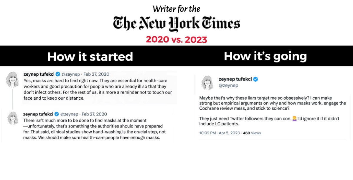5. Tufekci has zero expertise in epidemiology, but she has a knack for cultivating editors looking for social media influencers to market clickbait essays to the Ted Talk & NPR tote bag crowd. Just look through her record. 1 study on masks