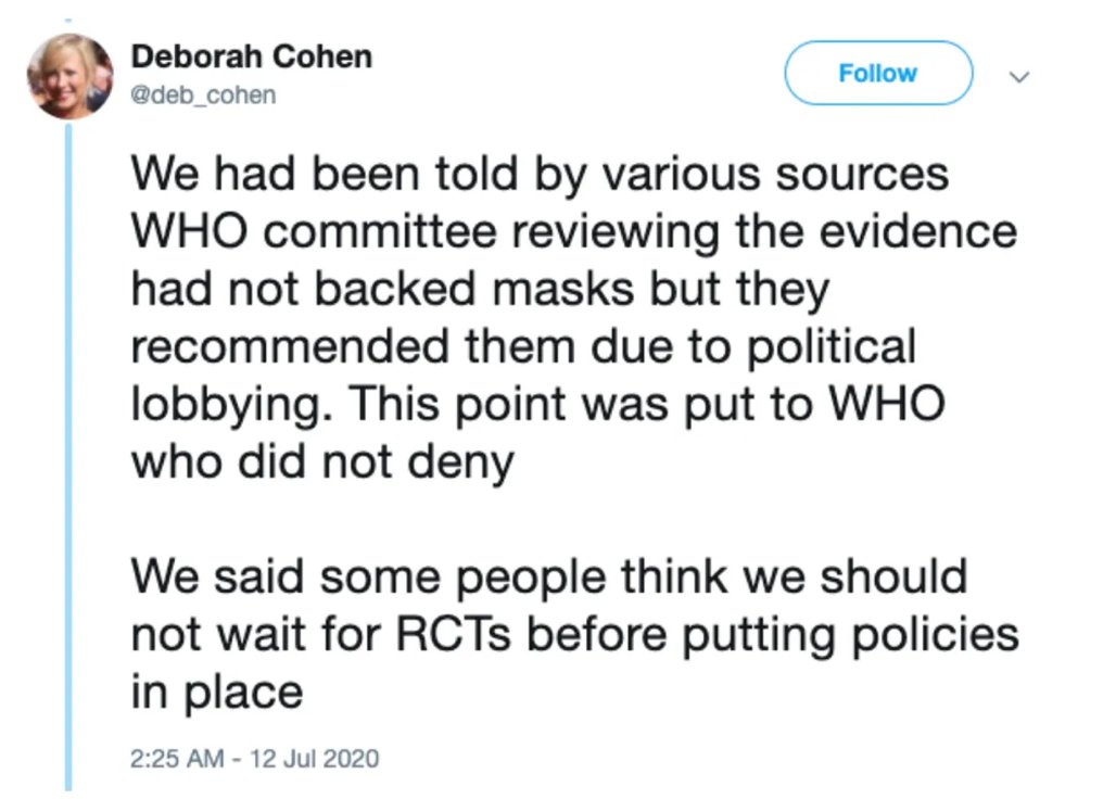 8. BBC's medial correspondent reported that "political lobbying" changed the WHO policy. Surprise! Zeynep tweeted that she influenced WHO, as well.