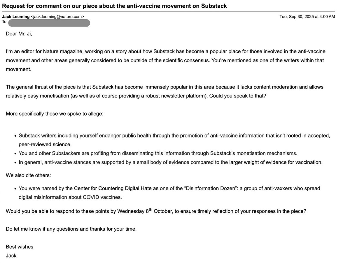 1️⃣Last week, Nature — the flagship journal of “scientific consensus” — sent me and other prominent Substack writes a “request for comment.” (@RWMaloneMD @MaryanneDemasi @sasha_latypova @P_McCulloughMD and others) But it wasn’t journalism. It was a prosecution dressed as inquiry. 🚨A prewritten verdict accusing us of endangering public health and profiting from misinformation.