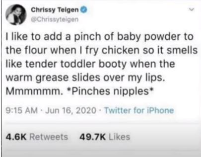 🧵5/10 Also Chrissy Teigan…..as seen with panda above ⬆️ Who the f*ck would type this and post it? And feel comfortable doing so…? 6⬇️ https://t.co/mhMgL0OBbR