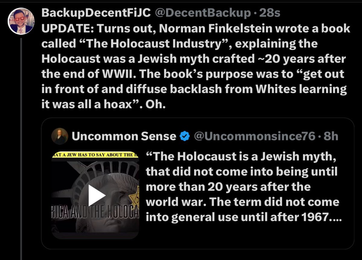 UPDATE: Turns out, Norman Finkelstein wrote a book called “The Holocaust Industry”, explaining the Holocaust was a Jewish myth crafted ~20 years after the end of WWII. The book’s purpose was to “get out in front of and diffuse backlash from Whites learning it was all a hoax”. Oh.