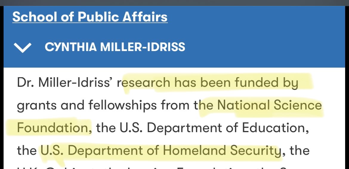 13. Cynthia Miller-Idriss is the very example of the government-funded whole-of-society censorship apparatus this hearing is supposed to be about. Her censorship work (that’s what “digital literacy” and “misinformation research” are) is funded by NSF and DHS —- YOUR tax dollars: