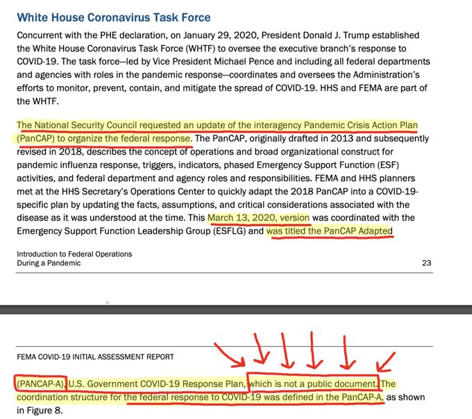 (13/17) The NSC took a reasonable pandemic response plan—PanCAP—and requested an "updated" plan—PanCAP-A. PanCAP-A, which set COVID policy for the U.S., *****IS NOT A PUBLICLY AVAILABLE DOCUMENT.***** Source for tweets 12/17 & 13/17: https://www.fema.gov/sites/default/files/documents/fema_covid-19-initial-assessment-report_2021.pdf