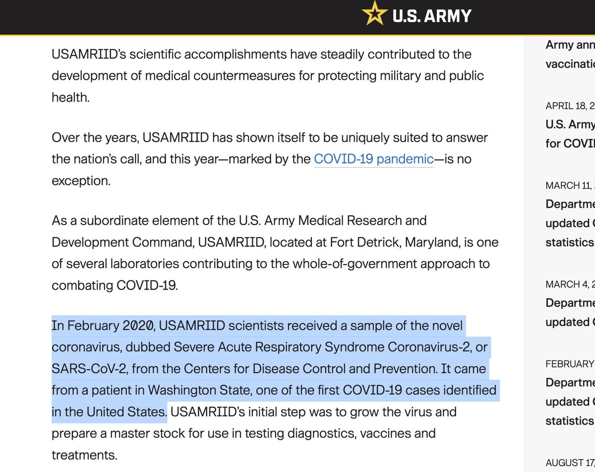 (4/17) Note that, as Latypova says, "patient zero" in the U.S. (who supposedly came from Wuhan to Seattle, Washington) was never confirmed—by anyone. The U.S. Army reported in September of 2020 that the "master stock" (what Sammons-Jackson referred to), was received in February 2020 from "a patient in Washington State." Source: https://www.army.mil/article/238943/unique_army_lab_answers_nations_call_in_supporting_covid_19_response