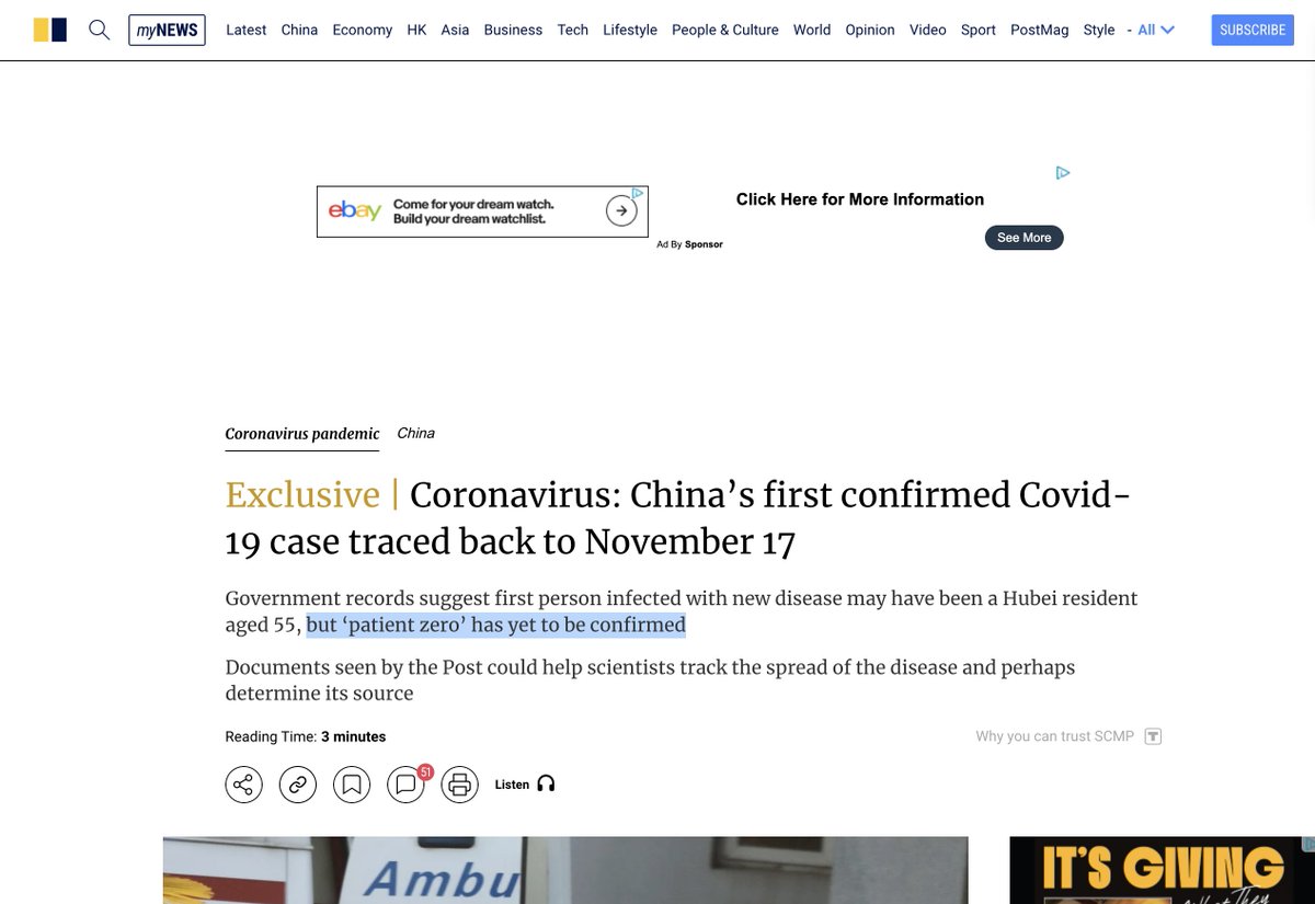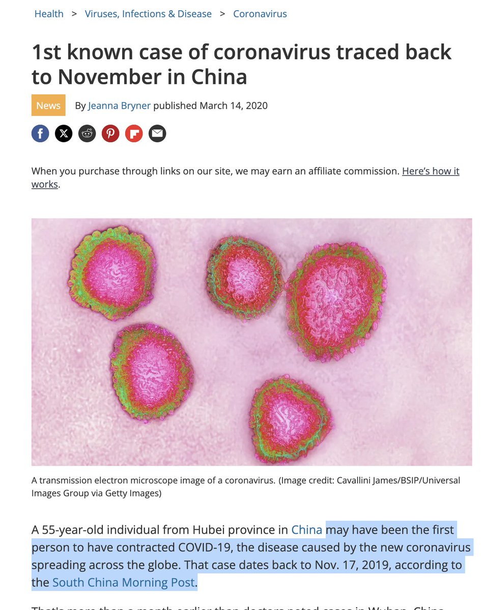 (5/17) As Latypova notes, the COVID-19 "patient zero" in Wuhan was also never identified. Live Science, for example, says "A 55-year-old individual from Hubei province in China *MAY* have been the first person to have contracted COVID-19, the disease caused by the new coronavirus spreading across the globe." (Emphasis added.) Source: https://www.livescience.com/first-case-coronavirus-found.html Live Science references The South China Morning Post, which reported in March 2020 that "Government records suggest first person infected with new disease *MAY* have been a Hubei resident aged 55, but 'PATIENT ZERO' HAS YET TO BE CONFIRMED." (Emphasis added.) Source: https://www.scmp.com/news/china/society/article/3074991/coronavirus-chinas-first-confirmed-covid-19-case-traced-back