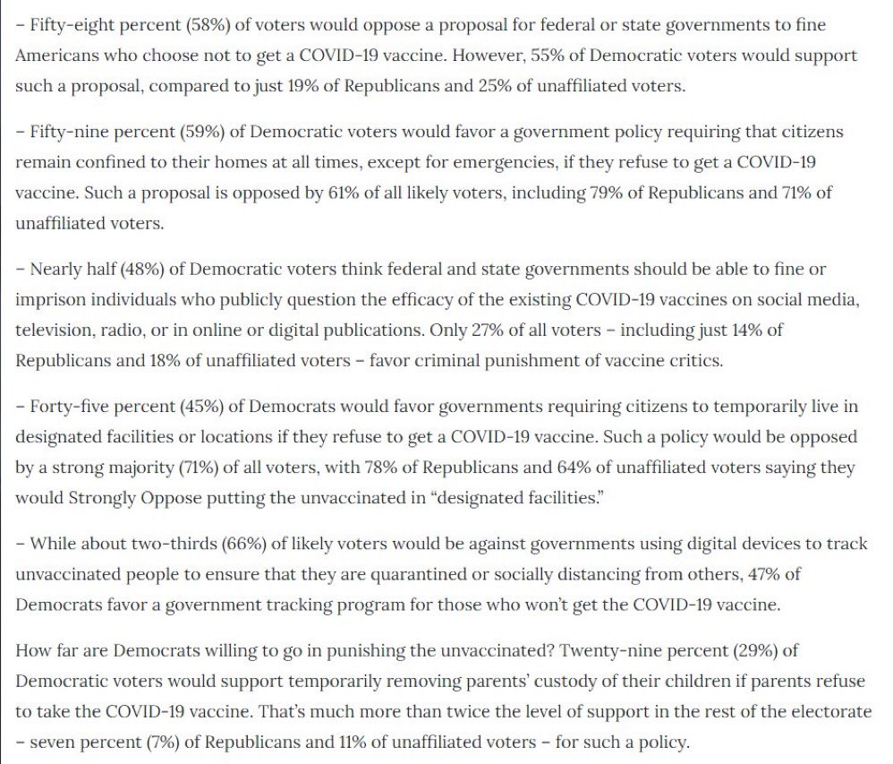 This poll highlighted just how authoritarian the left was becoming during Covid-19... Among Democrat voters: - 55% supported fines against the unvaccinated simply for refusing the jab. - 59% supported permanent house confinement for anyone who refused to get vaccinated. - 48% supported fines or PRISON for questioning vaccine efficacy on social media. - 45% supported the government having the ability to put the unnvaccinated in "designed facilities" aka internment camps. - 47% supported "a government tracking program" to monitor unvaccinated citizens. - 29% supported the state being able to REMOVE UNVACCINATED PARENTS' CUSTODY OVER THEIR OWN CHILDREN. This was over a year ago as well... how much worse do you think this has gotten since then?
